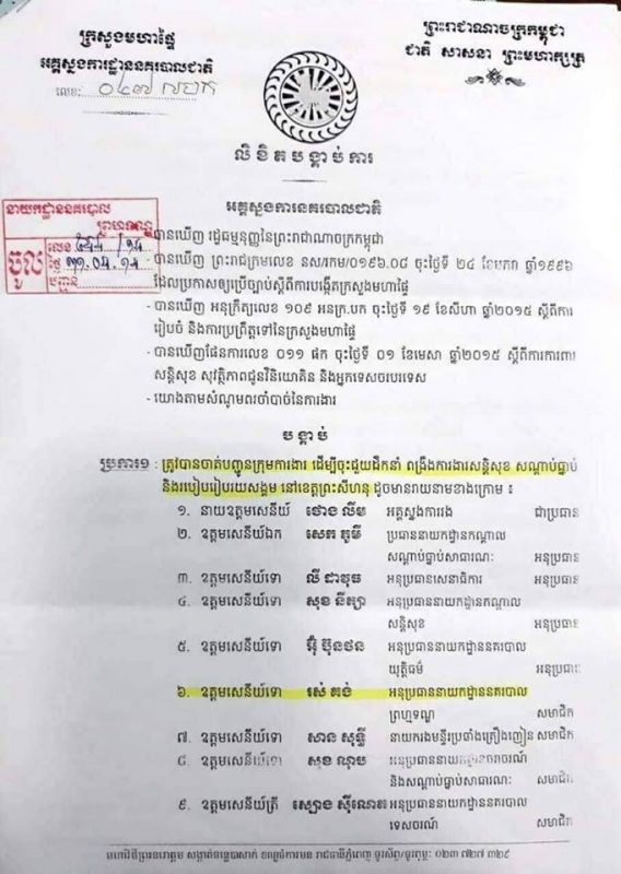 (ព្រះសីហនុ)៖ លោកនាយឧត្តមសេនីយ៍ នេត សាវឿន អគ្គស្នងការនគរបាលជាតិ នៅថ្ងៃទី៣១ ខែសីហា ឆ្នាំ២០១៨ បានចេញលិខិតបង្កាប់ការចាត់បញ្ជូនក្រុមការងារ ដើម្បីចុះជួយដឹកនាំ ពង្រឹងការងារសន្តិសុខ សណ្តាប់ធ្នាប់ និងរបៀបរៀបរយសង្គម នៅខេត្តព្រះសីហនុ ដែលមានថ្នាក់ដឹកនាំជាន់ខ្ពស់នគរបាលជាតិប្រមាណ១១រូប ដោយចាប់ពីសក្តិ៥​រហូតដល់ផ្កាយ៤ និងពីថ្នាក់អនុប្រធាននាយកដ្ឋាន រហូតដល់អគ្គស្នងការរងនគរបាលជាតិ ដែលដឹកនាំដោយ លោកនាយឧត្តមសេនីយ៍ ថោង លីម អគ្គស្នងការរងនគរបាលជាតិ ។