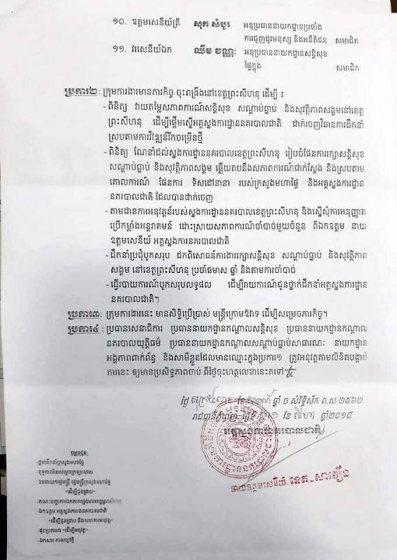 យោងតាមប្រការ២នៃលិខិតបង្កាប់ការនេះបានចែងថា៖ ក្រុមការងារមានភារកិច្ច ចុះពង្រឹងនៅខេត្តព្រះសីហនុ ដើម្បី៖