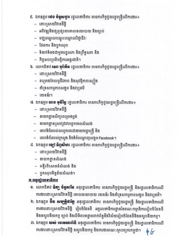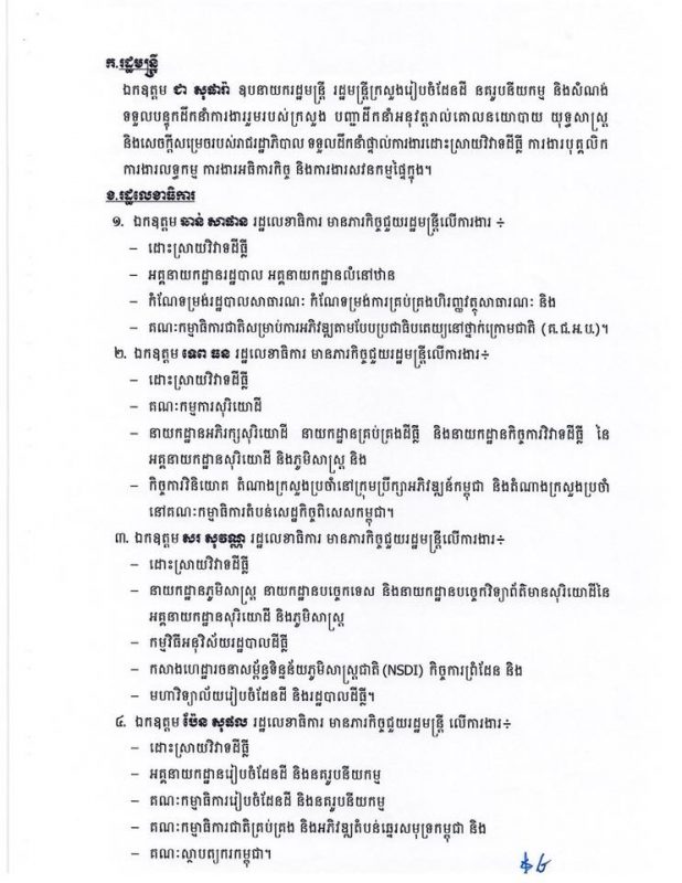 (ភ្នំពេញ)៖ លោក ជា សុផារ៉ា ឧបនាយករដ្ឋមន្ត្រី រដ្ឋមន្ត្រីក្រសួងរៀបចំដែនដី នគរូបនីយកម្ម និងសំណង់ បានចេញសេចក្តីសម្រេចស្តីពីការរបៀបរបបការងារ និងការបែងចែកភារកិច្ចជូនដល់រដ្ឋលេខាធិការចំនួន៨នាក់ និងអនុរដ្ឋលេខាធិការ១៥នាក់ សំដៅធានាការដឹកនាំ និងអនុវត្តកិច្ចការរបស់ក្រសួងរៀបចំដែនដី នគរូបនីយកម្ម និងសំណង់ ។