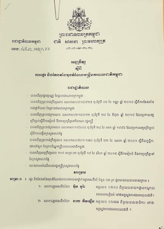 ១.លោកឧត្តមសេនីយ៍ឯក អ៊ិន បូរ៉ា អត្តលេខ ០២១០ ពីប្រធាននាយកដ្ឋានកណ្តាលនគរបាលយុត្តិធម៌ ទៅជាអគ្គស្នងការរងនគរបាលជាតិ ។