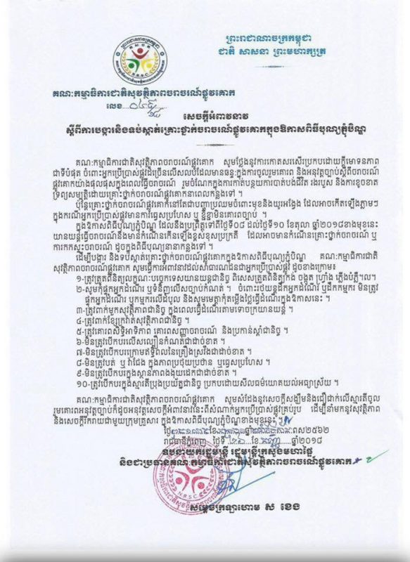 សម្ដេចក្រឡាហោម ស ខេង ចេញសេចក្ដីអំពាវនាវស្ដីពីការបង្ការ និងទប់ស្កាត់គ្រោះថ្នាក់ចរាចរណ៍ផ្លូវគោកក្នុងឱកាសពិធីកាន់បិណ្ឌ និងពិធីបុណ្យភ្ជុំបិណ្ឌ