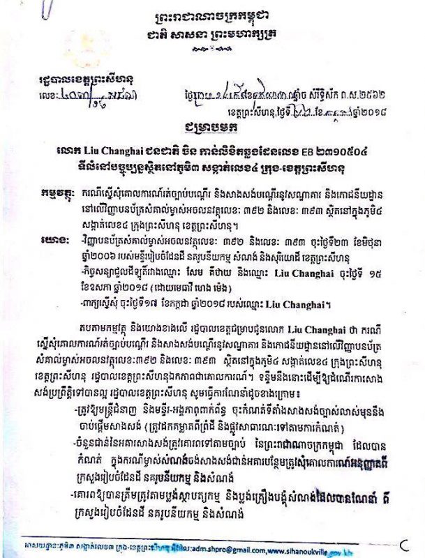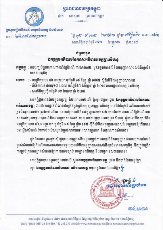 (ព្រះសីហនុ)៖ ក្រោយពេលក្រសួងរៀបចំដែនដី នគរូបនីយកម្ម និងសំណង់ ចេញលិខិតជម្រាបមកលោកអភិបាលខេត្តព្រះសីហនុ អោយបញ្ឈប់ការចេញលិខិតអនុញ្ញាតជាគោលការណ៍ឲ្យដំណើរការសាងសង់ មុនទទួលបានលិខិតអនុញ្ញាតសាងសង់ពីស្ថាប័នមានសមត្ថកិច្ច ដែលក្រសួងយល់ថា បណ្តាលឲ្យកើតមានបទល្មើសសំណង់ ប៉ះពាល់ដល់សណ្តាប់ធ្នាប់សាធារណៈ សោភណ្ឌភាព និងគុណភាពសំណង់ កាលពីថ្ងៃទី០៣ ខែតុលា ឆ្នាំ២០១៨ម្សិលម៉ិញនេះ ត្រូវបានអ្នកលេងបណ្តាញសង្គម Facebook ខ្លះអោយយោបល់គាំទ្ររ និងចំណាត់ការនេះ ក៏ប៉ុន្តែក៏មានអ្នកខ្លះមិនគាំទ្ររផងដែរ ។