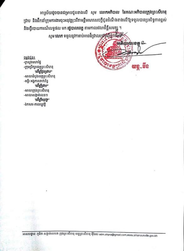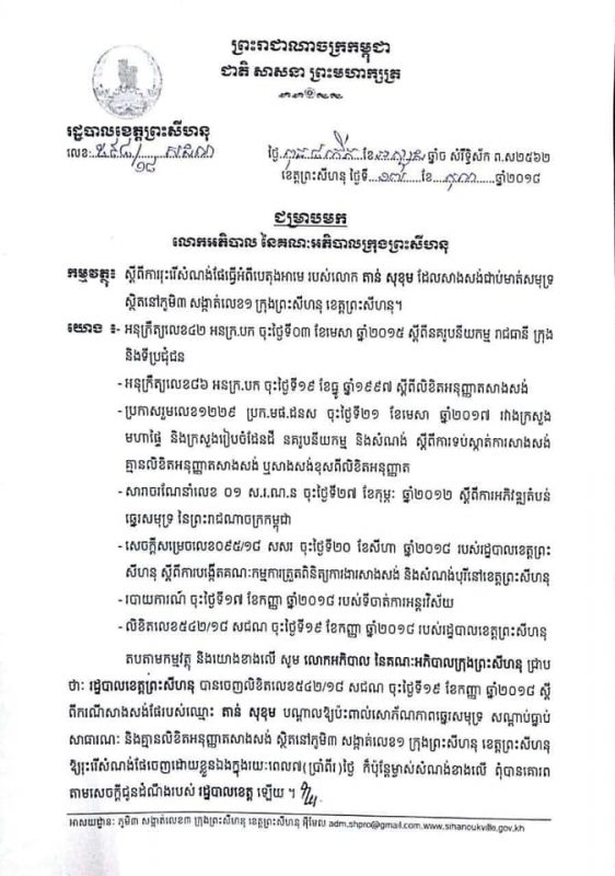 សូមបញ្ជាក់ថា កន្លងរដ្ឋបាលក្រុង និងរដ្ឋបាលខេត្ត ព្រមទាំងមន្ទីរជំនាញ បានចុះធ្វើកំណត់ហេតុផ្អាក់សំណង់នេះជាច្រើនដង ប៉ុន្តែម្ចាស់សំណង់នៅតែបន្តសាងសង់ ទើបរដ្ឋបាលខេត្ត ចេញលិខិតលេខ ៥៤២/១៨ សជណ ចុះថ្ងៃ១៩ ខែកញ្ញា ឆ្នាំ២០១៨ ឲ្យម្ចាស់រុះរើដោយខ្លួនឯង ដោយទុកពេល ៧ថ្ងៃ ប៉ុន្តែម្ចាស់មិនព្រមរុះរើឡើយ ។