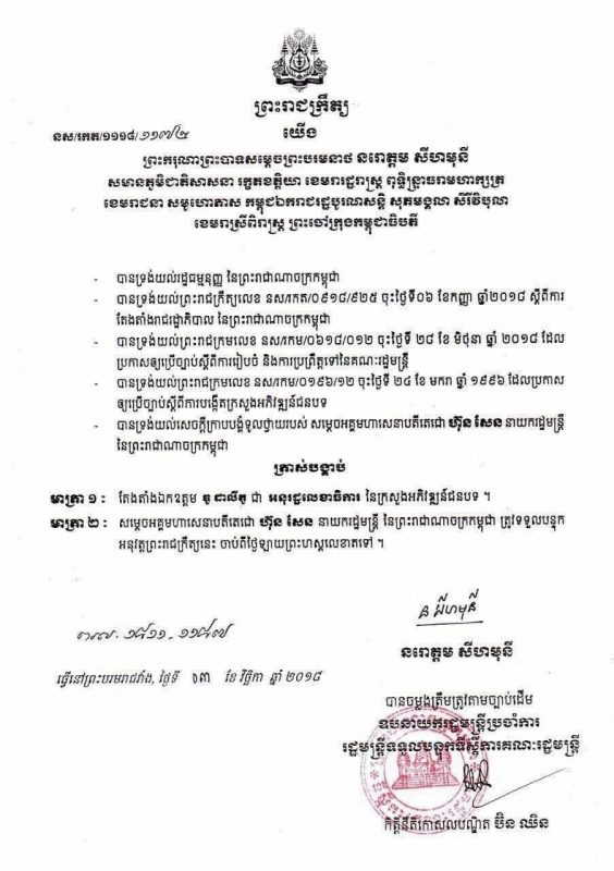 ខាងក្រោមនេះជាព្រះរាជក្រឹត្យរបស់ព្រះមហាក្សត្រកម្ពុជា៖
