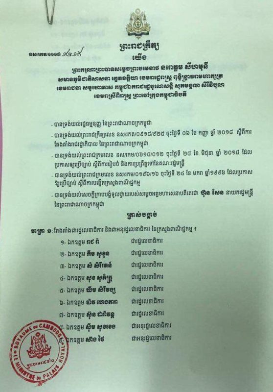 (ភ្នំពេញ)៖ ព្រះមហាក្សត្រនៃព្រះរាជាណាចក្រកម្ពុជា ព្រះករុណាព្រះបាទសម្តេចព្រះបរមនាថ នរោត្តម សីហមុនី  នៅថ្ងៃទី១០ ខែវិច្ឆិកា ឆ្នាំ២០១៨ បានចេញព្រះរាជក្រឹត្យត្រាស់បង្គាប់តែងតាំង រដ្ឋលេខាធិការ៧រូប និងអនុរដ្ឋលេខាធិការ៦រូប នៃក្រសួងពាណិជ្ជកម្ម ៕