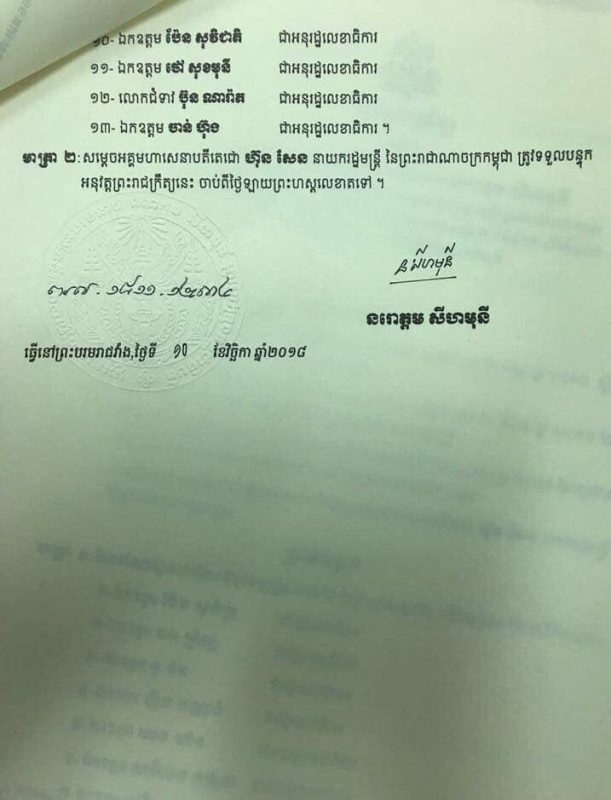 ខាងក្រោមនេះជាព្រះរាជក្រឹត្យរបស់ព្រះមហាក្សត្រនៃកម្ពុជា៖