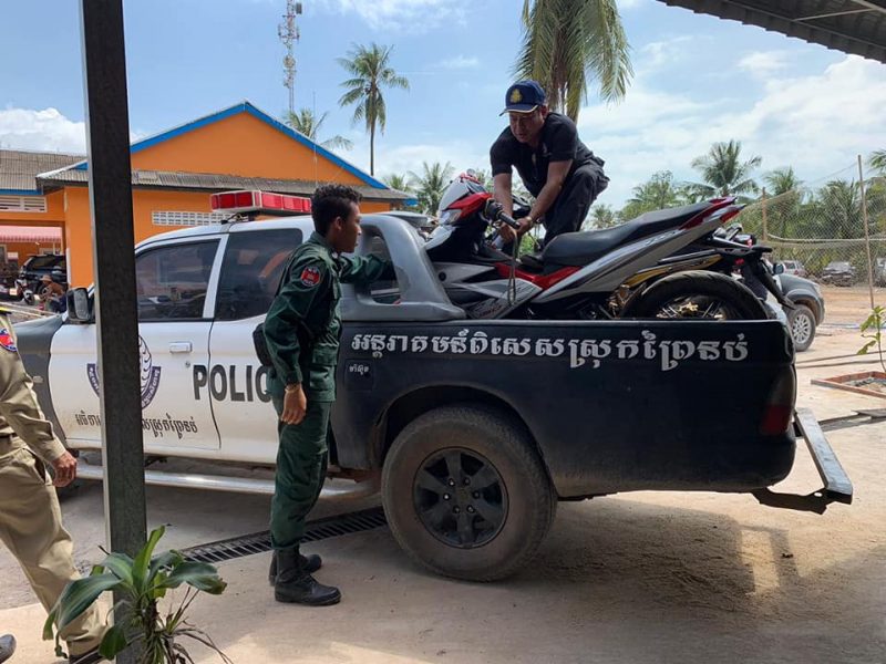 ករណីទី២.ក្រុមចោរលួចកាច់សោរយកម៉ូតូ និង ប្រើប្រាស់អាវុធខុសច្បាប់ ក្លែងបន្លំប្រើប្រាស់ ឯកសណ្ឋាននគរបាលជាតិ ។ ក្រុមនេះមានគ្នា ៣នាក់ ត្រូវបានសមត្ថកិច្ចចាប់ខ្លួនបាន ជាបន្តបន្ទាប់នៅ ថ្ងៃទី១៧ ខែវិច្ឆិកា ឆ្នាំ២០១៨ បន្ទាប់ពីពួកវាលួចបានម៉ូតូ១គ្រឿងម៉ាកហុងដាឌ្រីម២០១៨ ពីក្រុងព្រះសីហនុ ហើយជិះគេចតាមផ្លូវ ស្រុកស្ទឹងហាវ សំដៅទៅផ្លូវជាតិលេខ៤ បំរុងទៅភ្នំពេញ។ លុះមកដល់ចំណុចស្ពានទី៦ ក្នុងឃុំសំរុង ស្រុកព្រៃនប់ ត្រូវសមត្ថកិច្ចស្ទាក់ចាប់បានតែម្តង ។