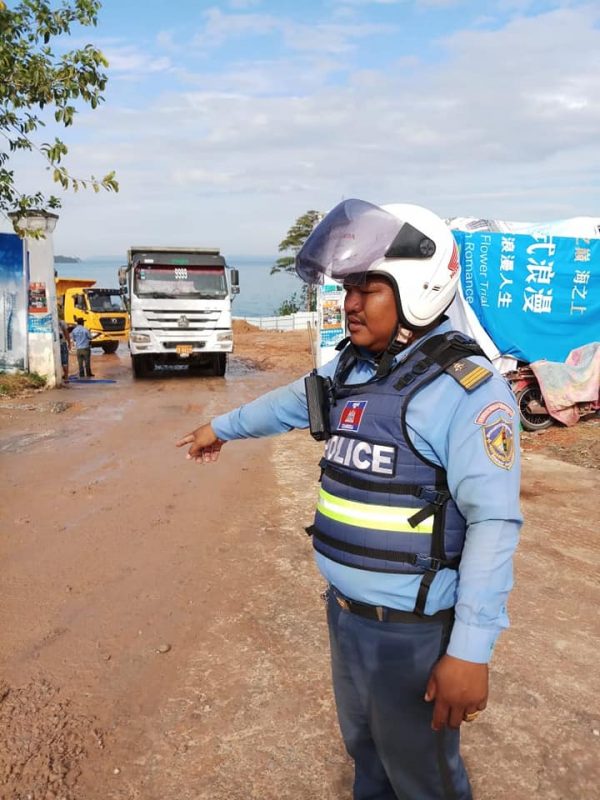 លោក​ឧត្តមសេនីយ៍ត្រី​ អ៊ី​ សុខា​ ស្នងការ​រងទទួល​ផែន​សណ្ដាប់​ធ្នាប់ចរាចរណ៍ បាន​ឲ្យ​ដឹង​ថាៈ​ នៅ​ព្រឹកថ្ងៃទី​២០ ខែវិច្ឆិកា ឆ្នាំ​២០១៨ នេះ​កំលាំងសមត្ថកិច្ច​នគរបាលចរាចរណ៍ផ្លូវគោក​ខេត្ត​ព្រះសីហនុ​ បាន​ឃាត់​រថយន្ត​ដឹក​ដី​ ចេញ​ចូល​ ក្រុមហ៊ុន​សំណង់​ចិន​មួយ​កន្លែង​ នៅ​ជិត​វេទិកា​បុណ្យ​ជាតិ​៧មករា​ ក្បែរសួនច្បារ​ ​រូប​សំណាក់​កូនសោរ​សេដ្ឋកិច្ច​ ស្ថិត​ក្នុង​សង្កាត់​លេខ​៣​ ក្រុង​ព្រះសីហនុ​ ដោយ​បាន​បង្គាប់​ឲ្យ​ក្រុមហ៊ុន​សំណង់​ចិន​ ធ្វើការ​បាញ់​ទឹក​លាង​សម្អាត​ថ្នល់​ ឲ្យ​ស្អាត​ឡើង​វិញ​ ហើយ​ចាប់រថយន្តដឹកដី​ចំនួន​៦​គ្រឿង​ ដែលធ្លាក់​ដី​ប្រឡាក់ផ្លូវ យកមករក្សាទុកនៅ​ការិយាល័យនគរបាល​ចរាចរណ៍ផ្លូវគោក ដើម្បី​អប់រំ​ណែនាំ​ ឲ្យ​ធ្វើ​កិច្ចសន្យា​ ផ្អាក​ការ​ធ្វើចរាចរ​មួយ​រយៈ​ខ្លីផងដែរ ។
