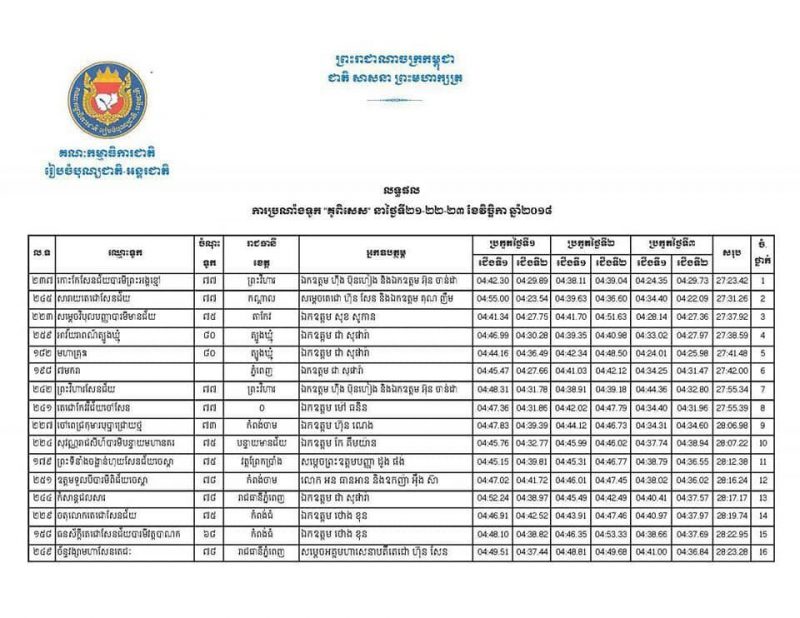 (ភ្នំពេញ)៖ ទីបំផុតការប្រណាំងទូករយៈពេល៣ថ្ងៃ ឆ្នាំ២០១៨នេះលទ្ធផលលេខ១បានទៅលើទូកឈ្មោះ “កោះកែសែនជ័យបារមីព្រះអង្គខ្មៅ” មានចំណុះ៧៧នាក់ មកពីវត្តប្រាសាទជ័យព្រឹក្ស សង្កាត់កំពង់ប្រណាក ក្រុងព្រះវិហារ ខេត្តព្រះវិហារ ដោយប្រើថេរវេលាសរុប ២៧នាទី និង២៣វិនាទី ដែលជាថេរវេលាលឿនជាងគេបំផុត ហើយទូកនេះទទួលបានការឧបត្ថម្ភដោយលោកនាយឧត្តមសេនីយ៍ ហ៊ីង ប៊ុនហៀង អគ្គមេបញ្ជាការរងនៃកងយោធពលខេមរភូមិន្ទ និងជាមេបញ្ជាការ បញ្ជាការដ្ឋានអង្គរក្ស និងលោក អ៊ុន ចាន់ដា អភិបាលខេត្តព្រះវិហារ ។