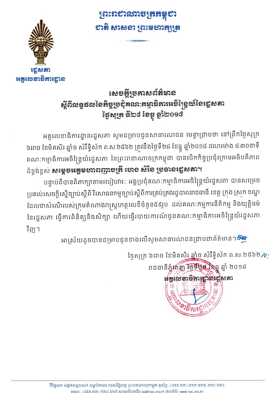 ភ្នំពេញ៖  គណៈកម្មាធិការអចិន្ត្រៃយ៍រដ្ឋសភា បានបើកកិច្ចប្រជុំមួយ ក្រោមអធិបតីភាព សម្តេច ហេង សំរិន ប្រធានរដ្ឋសភា ដើម្បីពិនិត្យសម្រេច វិសោធនកម្មច្បាប់ ស្តីពីការគ្រប់គ្រងរដ្ឋបាលរាជធានីខេត្ត ក្រុង ស្រុក ខណ្ឌនៅថ្ងៃទី២៨ ខែធ្នូ ឆ្នាំ២០១៨៕