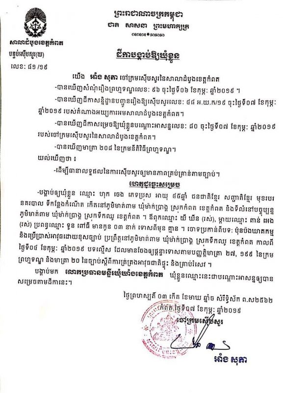 យោងតាមដីកាបង្គាប់ឲ្យឃុំខ្លួនលេខ ៨១/១៩ របស់សាលាដំបូងខេត្តកំពត ចុះហត្ថលេខាដោយលោក អាំង សុភា ចៅក្រមស៊ើបសួរបានសម្រេចឲ្យឃុំខ្លួនឈ្មោះ ហុក ចេង ភេទប្រុស អាយុ ៤៥ឆ្នាំ ជនជាតិខ្មែរ សញ្ជាតិខ្មែរ មុខរបរ នគរបាល ទីកន្លែងកំណើត នៅភូមិមាត់ពាម ឃុំម៉ាក់ប្រាង្គ ស្រុកទឹកឈូ ខេត្តកំពត ។ ឪពុកឈ្មោះ យី ឃីន (រស់) ម្តាយឈ្មោះ តាន់ អេង (រស់) ប្រពន្ធឈ្មោះ ទួន ពៅធី មានកូន៣នាក់ ទោសពីមុនគ្មាន ។ ចោទប្រកាន់ពីបទ៖ ប៉ុនប៉ងឃាតកម្ម និងប្រើប្រាស់អាវុធដោយខុសច្បាប់ ប្រព្រឹត្តនៅភូមិមាត់ពាម ឃុំម៉ាក់ប្រាង្គ ស្រុកទឹកឈូ ខេត្តកំពត កាលពីថ្ងៃទី០៤ ខែកុម្ភៈ ឆ្នាំ២០១៩ បទល្មើសដែលមានចែងឲ្យផ្តន្ទាទោសតាមបញ្ញត្តិមាត្រា ២៧, ១៩៩ នៃក្រមព្រហ្មទណ្ឌ និងមាត្រា ២០ នៃច្បាប់ស្តីពីការគ្រប់គ្រងអាវុធជាតិផ្ទុះ និងគ្រាប់រំសេវ ។