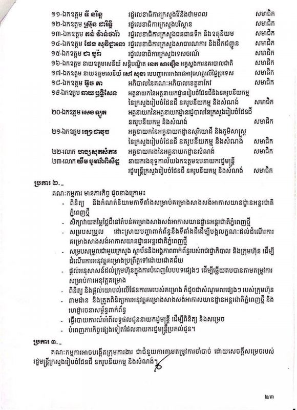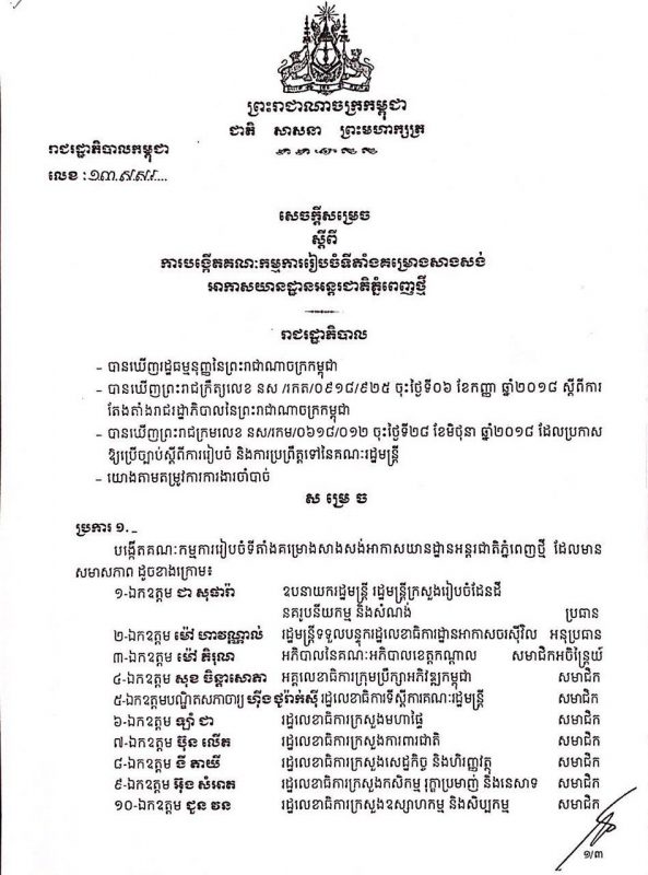 (ភ្នំពេញ)៖ អាកាសយានដ្ឋានអន្តរជាតិភ្នំពេញថ្មី ជិតកើតជារូបរាងឡើងហើយ ដោយពេលនេះរាជរដ្ឋាភិបាលកម្ពុជាដែលមាន សម្តេចតេជោ ហ៊ុន សែន នាយករដ្ឋមន្រ្តីនៃកម្ពុជា ជាប្រមុខដឹកនាំ បានចេញសេចក្តីសម្រេចមួយបានសម្រេចតែងតាំងលោកឧបនាយករដ្ឋមន្ត្រី ជា សុផារ៉ា រដ្ឋមន្ត្រីក្រសួងរៀបចំដែនដី នគរូបនីយកម្ម និងសំណង់ ជាប្រធាន លោក ម៉ៅ ហាវណ្ណាល់ រដ្ឋមន្ត្រីទទួលបន្ទុករដ្ឋលេខាធិការដ្ឋានអាកាសចរស៊ីវិល ជាអនុប្រធាន លោក ម៉ៅ ភិរុណ អភិបាលខេត្តកណ្តាល សមាជិកអចិន្ត្រៃយ៍ រួមនឹងសមាជិកចំនួន២០នាក់ផ្សេងទៀតផងដែរ ។