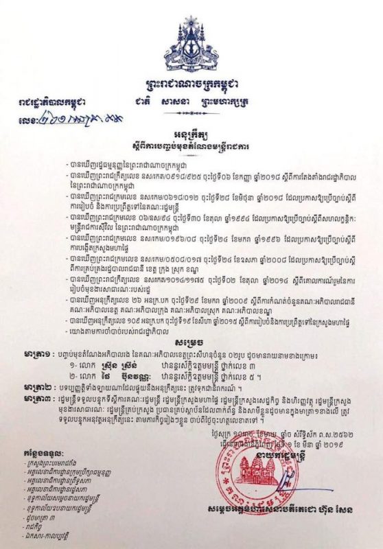 អភិក្រមទី៥ វះកាត់បន្តទៀតនៅខេត្តព្រះសីហនុ By Kamnottra - ថ្ងៃទី 1 ខែ មិនា 2019 355 (ភ្នំពេញ)៖ នៅព្រឹកថ្ងៃទី០១ ខែមីនា ឆ្នាំ២០១៩ សម្តេចតេជោ ហ៊ុន សែន នាយករដ្ឋមន្ត្រីកម្ពុជា បានសម្រេចដកអភិបាលរងខេត្តព្រះសីហនុ២រូប ។ សូមអានអនុក្រឹត្យរបស់សម្តេចតេជោ ដូចខាងក្រោម៖