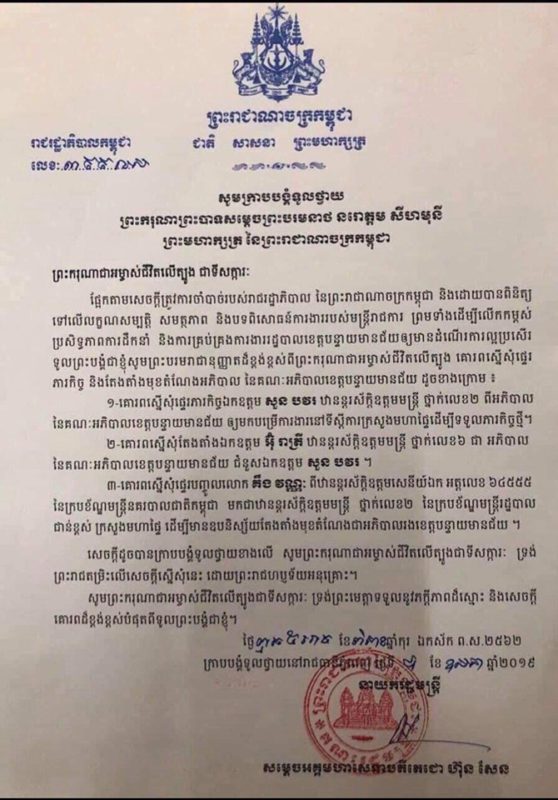 ការចេញព្រះរាជក្រឹត្យនេះ បានធ្វើឡើងបន្ទាប់ពីមានការទូលថ្វាយដោយ សម្ដេចតេជោ ហ៊ុន សែន នាយករដ្ឋមន្រ្តីនៃកម្ពុជា ដើម្បីស្នើផ្ទេរភារកិច្ច លោក សួន បវរ ឱ្យមកបម្រើការងារនៅក្រសួងមហាផ្ទៃ ហើយតែងតាំងអភិបាលរងខេត្តម្នាក់ គឺលោក អ៊ុំ រាត្រី ជាអភិបាលខេត្តជំនួសវិញ ។