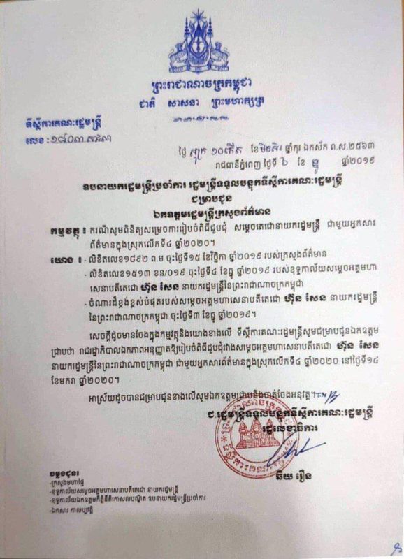 នេះបើតាមលិខិតរបស់ទីស្តីការគណៈរដ្ឋមន្ត្រី ចុះថ្ងៃទី០៦ ខែធ្នូ ឆ្នាំ២០១៩ ដែលអ្នកសារព័ត៌មានទើបទទួលបាននៅយប់ថ្ងៃទី១០ ខែធ្នូ ឆ្នាំ២០១៩នេះ ។