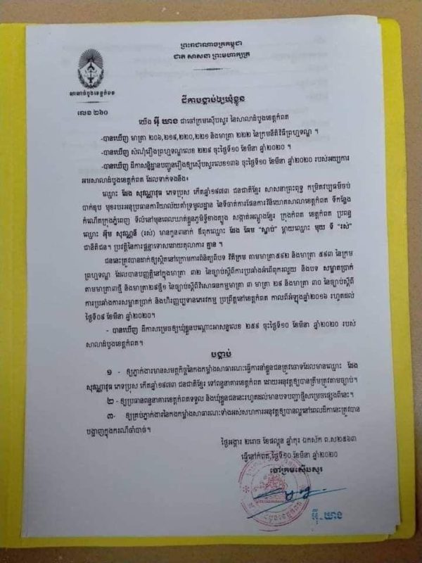 យោងតាមដីកាបង្គាប់ឲ្យឃុំខ្លួនលេខ ២៦០ ចុះថ្ងៃទី១០ ខែមីនា ឆ្នាំ២០២០ របស់លោក អ៊ី ឃាង ចៅក្រមស៊េីបសួរ សាលាដំបូងខេត្តកំពត បានបញ្ជាក់ថា ឈ្មោះ ដែង សុវណ្ណាវុធ ភេទប្រុស កើតឆ្នាំ១៩៧៣ ជនជាតិខ្មែរ សាសនាព្រះពុទ្ធ កំរិតវប្បធម៌ចប់បាក់ឌុប មុខរបរជាអនុប្រធានការិយាល័យគាំទ្រមូលដ្ឋាន នៃទីចាត់ការផែនការវិនិយោគសាលាខេត្តកំពត។