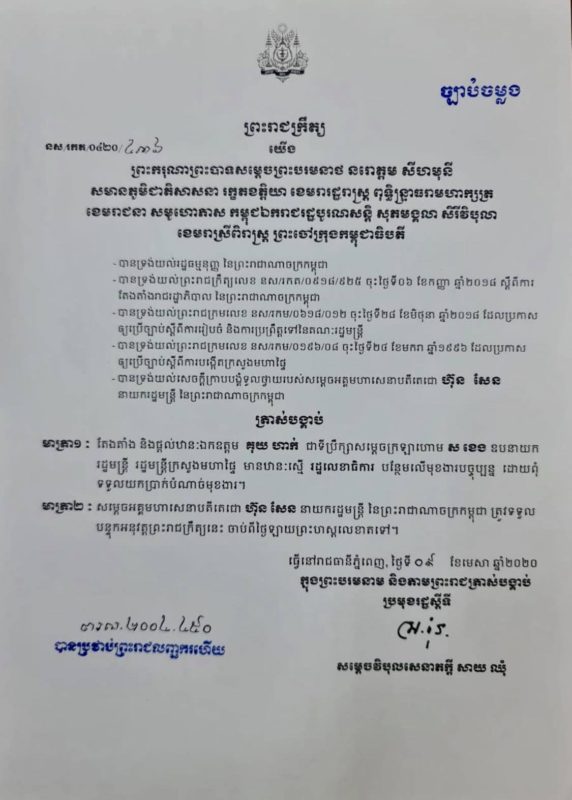 ភ្នំពេញ៖ សម្តេច សាយ ឈុំ ប្រមុខរដ្ឋស្តីទី នៅថ្ងៃទី០៩ ខែមេសា ឆ្នាំ២០២០ បានចេញព្រះរាជត្រាស់បង្គាប់តែងតាំង ឯកឧត្តម គុយ ហាក់ ជាទីប្រឹក្សាសម្តេចក្រឡាហោម ស ខេង ឧបនាយករដ្ឋមន្ត្រី រដ្ឋមន្ត្រីក្រសួងមហាផ្ទៃ មានឋានៈស្មេីរដ្ឋលេខាធិការ បន្ថែមលេីមុខងារបច្ចុប្បន្ន ដោយពុំទទួលយកប្រាក់មុខងារ ។