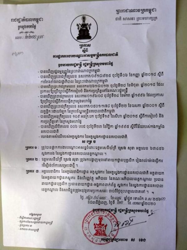 ក្នុងលិខិតនេះបានតំរូវអោយលោក ស្រេង សុខា ត្រូវមកបង្ហាញខ្លួនរៀងរាល់ម៉ោងការងារនៅនាយកដ្ឋានបុគ្គលិក នៃអគ្គស្នងការដ្ឋាននគរបាលជាតិ ដើម្បីរង់ចាំការសម្រេចជាថ្មី នេះបើតាមប្រកាសរបស់សម្តេចក្រឡាហោម ស ខេង ចុះថ្ងៃទី២១ ខែមេសា ឆ្នាំ២០២០នេះ ។