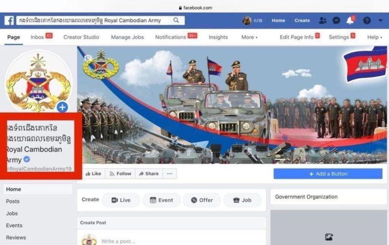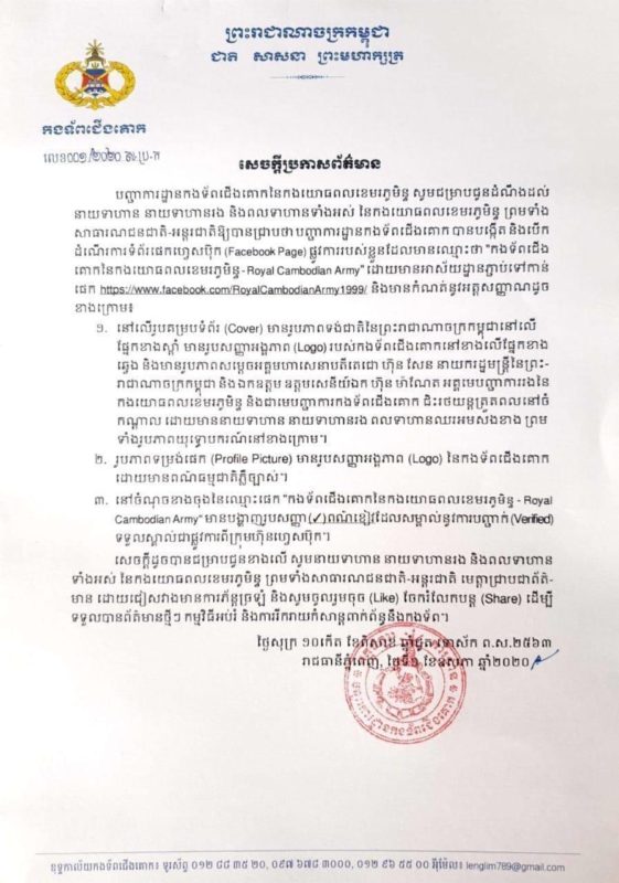 ភ្នំពេញ៖ ផេក Facebook បញ្ជាការដ្ឋានកងទ័ពជើងគោកនៃកងយោធពលខេមរភូមិន្ទ ត្រូវបានក្រុមហ៊ុន Facebook ទទួលស្គាល់ជាផ្លូវការហើយដោយផ្តល់សញ្ញា ធីក√ពណ៌ខៀវជាសញ្ញាសម្គាល់ផ្លូវការ ។ បើតាមការជូនដំណឹងរបស់បញ្ជាការដ្ឋានកងទ័ពជើងគោកនៃកងយោធពលខេមរភូមិន្ទ នៅព្រឹកថ្ងៃទី០១ ខែឧសភា ឆ្នាំ២០២០នេះ បានជម្រាបជូននាយទាហាន នាយទាហានរង ពលទាហាន និងសាធារណជនជ្រាបថា÷ កងទ័ពជើងគោកកម្ពុជាបានបង្កើត និងបើកដំណើរការ Facebook Page ផ្លូវការរបស់ខ្លួនដែលមានឈ្មោះថា “កងទ័ពជើងគោកនៃកងយោធពលខេមរភូមិន្ទ-Royal Cambodian Army” ។
