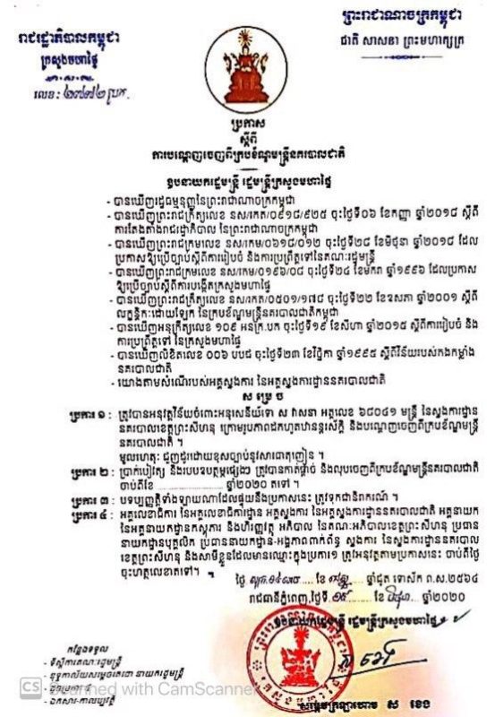 ក្នុងប្រការ២នៃប្រកាសនេះបានបញ្ជាក់ថា ប្រាក់បៀវត្ស និងរបបឧបត្ថម្ភផ្សេងៗត្រូវបានកាត់ផ្តាច់ និងលុបចេញពីក្របខណ្ឌមន្ត្រីនគរបាលជាតិចាប់ពីឆ្នាំ២០២០នេះតទៅ ។