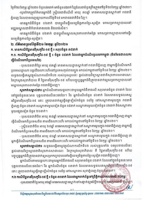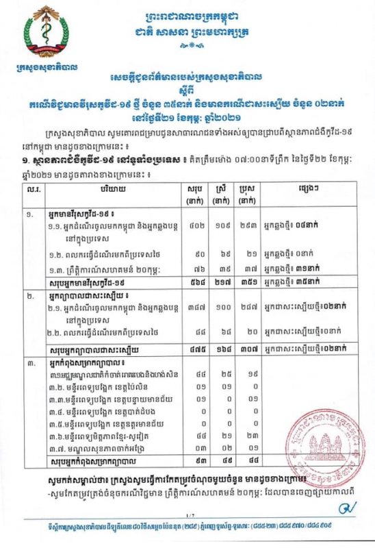 ភ្នំពេញ៖ ក្រសួងសុខាភិបាល នៅព្រឹកថ្ងៃទី២២ ខែកុម្ភៈ ឆ្នាំ២០២១នេះ បានប្រកាសព័ត៌មានបញ្ជាក់ពីការរកឃើញអ្នកឆ្លងកូវីដ១៩ចំនួន ៣៥នាក់ ក្នុងនោះមាន៣១នាក់ឆ្លងចូលសហគមន៍ ដែលពាក់ព័ន្ធ “ព្រឹត្តិការណ៍សហគមន៍២០ កុម្ភៈ” និង៤នាក់ជាអ្នកដំណើរមកពីក្រៅប្រទេស។ នៅថ្ងៃទី២២នេះក្រសួងក៏បានប្រកាស ពីការព្យាបាលជាសះស្បើយ ចំនួន២នាក់ផងដែរ ។