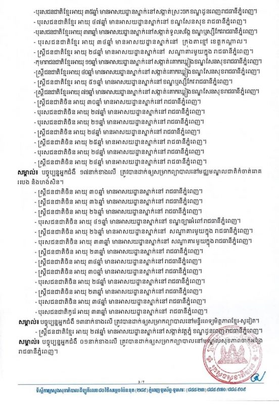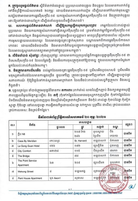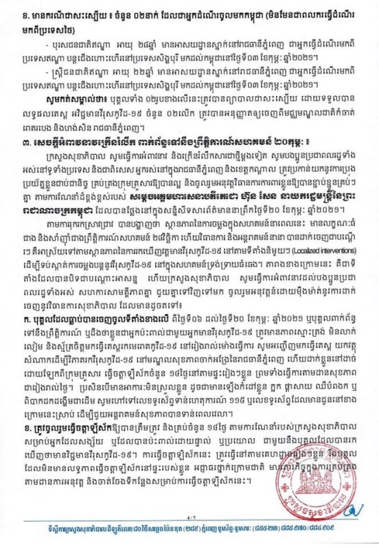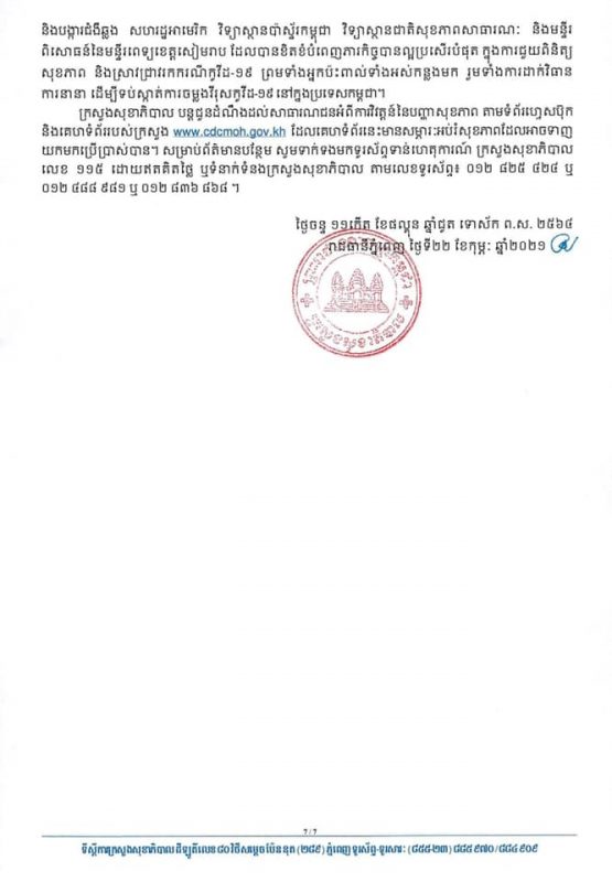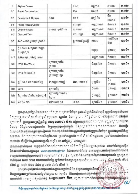 ក្រសួងសុខាភិបាល សូមអំពាវនាដល់អ្នកដែលពាក់ព័ន្ធ ធ្លាប់ចេញចូលទីតាំងចំនួន២៣ (មានក្នុងតារាង) ចាប់ពីថ្ងៃទី០៦ ដល់ ថ្ងៃទី២០ ខែកុម្ភៈ ឆ្នាំ២០២១ ឬបុគ្គលដែលពាក់ព័ន្ធព្រឹត្តិការណ៍ ឬដឹងខ្លួនថា ជាអ្នកប៉ះពាល់ជាមួយអ្នកជំងឺកូវីដ១៩ ត្រូវមានភាពស្មោះត្រង់ មិនលាក់លៀម និងស្ម័គ្រចិត្តមកធ្វើតេស្តរកកូវីដ១៩ នៅមណ្ឌលសុខភាពចាក់អង្រែ ហើយដាក់ខ្លួនឲ្យនៅដាច់ដោយឡែកពីក្រុមគ្រួសារ ធ្វើចត្តាឡីស័កចំនួន ១៤ថ្ងៃ នៅតាមផ្ទះរៀងៗខ្លួន ព្រមទាំងតាមដានសុខភាពជារៀងរាល់ថ្ងៃ ។ ប្រសិនមានអាការមិនស្រួលខ្លួន ដូចជាឡើងកំដៅខ្លួន ក្អក ផ្តាសាយ ឈឺបំពង់ក ឬពិបាកដកដង្ហើមជាដើម សូមហៅទៅលេខទូរស័ព្ទទាន់ហេតុការណ៍ ១១៥ ។