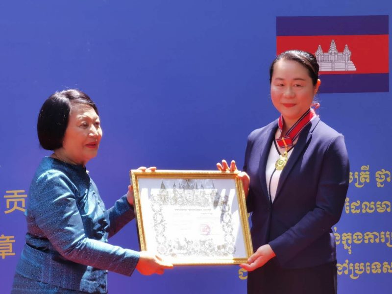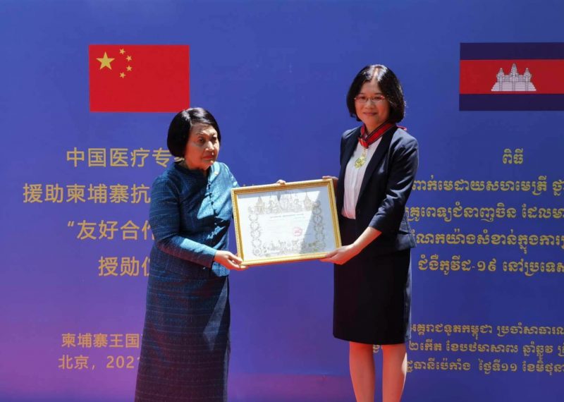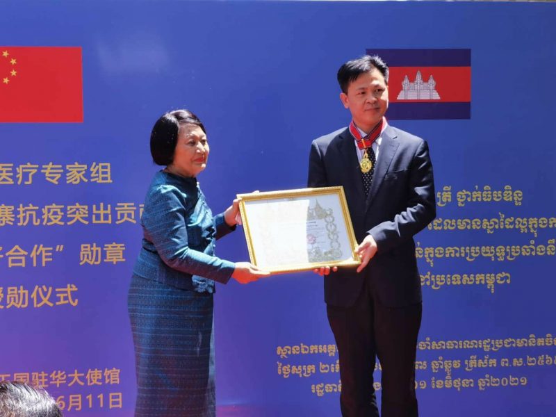រដ្ឋធានីប៉េកាំង៖ នាថ្ងៃទី១១ ខែមិថុនា ឆ្នាំ២០២១ លោកស្រី ខែក កែមាលី ស៊ីសូដា ឯកអគ្គរាជទូតព្រះរាជាណាចក្រកម្ពុជាប្រចាំសាធារណរដ្ឋប្រជាមានិតចិន តំណាងឱ្យរាជរដ្ឋាភិបាលកម្ពុជាបំពាក់មេដាយសហមេត្រីថ្នាក់ធិបឌិន្ទជូនដល់លោក Ai Xiang និងក្រុមអ្នកជំនាញវេជ្ជសាស្រ្តចិនផ្សេងទៀតសរុប៧រូប ដែលអញ្ជើញមកពីតំបន់ស្វយ័ត Guangxi ដែលពួកគាត់បានរួមចំណែកយ៉ាងសកម្មក្នុងកិច្ចទប់ស្កាត់លើជំងឺវីរុសកូវីដ-១៩នៅក្នុងប្រទេសកម្ពុជា ដោយពិធីខាងលើត្រូវបានរៀបចំឡើងក្នុងរដ្ឋធានីប៉េកាំងប្រទេសចិន ។