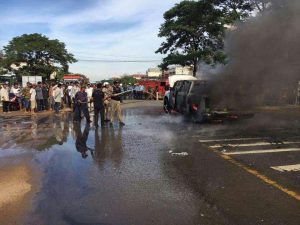 កណ្ដាល៖រថយន្តToyota Tundra មួយគ្រឿងឆេះទាំងស្រុង កាលព្រឹកថ្ងៃទី១០ ខែកក្កដា ឆ្នាំ២០១៧ នេះ នៅចំណុចផ្លូវជាតិលេខ៤ មុខភូមិបែកចាន ឃុំបែកចាន ស្រុកអង្គស្នួលខេត្តកណ្តាល ។បើតាមអោយដឹងក្នុងរបាយការណ៍នគរបាល បានបង្ហាញថា មានអគ្គិភ័យឆេះរថយន្តមួយគ្រឿងម៉ាកTundra ពណ៌ស ពាក់ផ្លាកលេខភ្នំពេញ2AN-6896 បើកបរដោយឈ្មោះ ឆឹម ឬទ្ធី ភេទប្រុស អាយុ៣៨ឆ្នាំ នៅផ្ទះD៥៤ ភូមិទួលគោក សង្កាត់ទួលសង្កែ ខណ្ឌឫស្សីកែវ បើកពីកើតទៅលិច ភ្នំពេញ ទៅព្រះសីហនុ ដល់ចំណុចកើតហេតុ បានឆេះផ្នែកខាងក្រោយរថយន្ត ។មូលហេតុបណ្តាលមកពីឆ្លងទុយោ ប្រេងសាំងនិងខ្សែភ្លើងដែលជាងទើបធ្វើ។ រថយន្តខូចខាតទាំងស្រុងកម្លាំងអធិការដ្ឋាននិងប៉ុស្តិ៍៣៥នាក់ រថយន្តពន្លត់ អគ្គិភ័យស្រុកចំនួន២គ្រឿងប្រើប្រាស់ទឹ កអស់៤រថយន្ត៕
