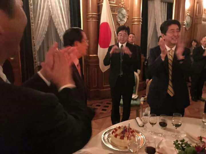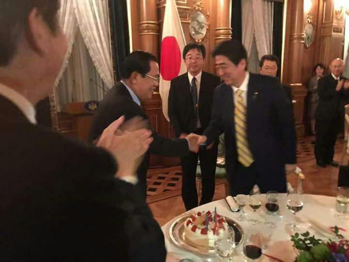 (តូក្យូ-ជប៉ុន)៖ នៅក្នុងពិធីស្រស់ស្រូបអាហារពេលល្ងាចនៅល្ងាចថ្ងៃទី០៧ ខែសីហា ឆ្នាំ២០១៧នេះ នាយករដ្ឋមន្រ្តីជប៉ុន លោក ស៊ិនហ្សូ អាបេ បានធ្វើខួបកំណើតជូនសម្តេចតេជោ ហ៊ុន សែន នាយករដ្ឋមន្រ្តីនៃកម្ពុជា គម្រប់ខួប ៦៧ឆ្នាំ។ជាមួយនំខួបកំណើតអមដោយភ្លើងទានចម្រុះពណ៌ទាំងលោកនាយករដ្ឋមន្រ្តីជប៉ុន និងមន្រ្តីជាន់ខ្ពស់របស់រាជរដ្ឋាភិបាលកម្ពុជា ព្រមទាំងមន្រ្តីជាន់ខ្ពស់របស់រដ្ឋាភិបាលជប៉ុន បានច្រៀងចម្រៀងអបអរខួបកំណើតយ៉ាងកងរំពងក្នុងបន្ទប់ទទួលទានអាហារ។តាមរយៈការរៀបចំខួបកំណើតនេះ បានបង្ហាញឲ្យឃើញពីចំណងមិត្តភាពដ៏ផ្អែមល្ហែមដូចនំខួបកំណើតរវាងលោកនាយករដ្ឋមន្រ្តីជប៉ុន លោក អាបេ ជាមួយសម្តេចតេជោ ហ៊ុន សែន ប្រមុខរាជរដ្ឋាភិបាលកម្ពុជា។សូមបញ្ជាក់ថា នៅថ្ងៃទី០៥ ខែសីហា ឆ្នាំ២០១៧ ដែលទើបកន្លងទៅថ្មីៗនេះ សម្តេចតេជោ ហ៊ុន សែន បានឈានចូលដល់អាយុ ៦៧ឆ្នាំហើយ។ ថ្ងៃកំណើតរបស់សម្តេចតេជោ ហ៊ុន សែន គេសង្កេតឃើញមន្រ្តីរាជរដ្ឋាភិបាលកម្ពុជាជាច្រើន បានជូនពរសម្តេចឲ្យទទួលបានសុខភាពល្អបរិបូរណ៍ ដើម្បីបន្តការដឹកនាំប្រទេសកម្ពុជាឲ្យកាន់តែរីកចម្រើនថែមទៀត៕