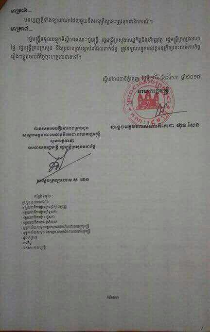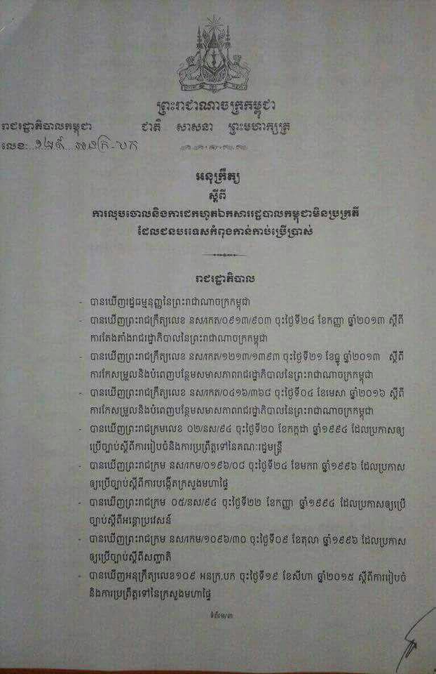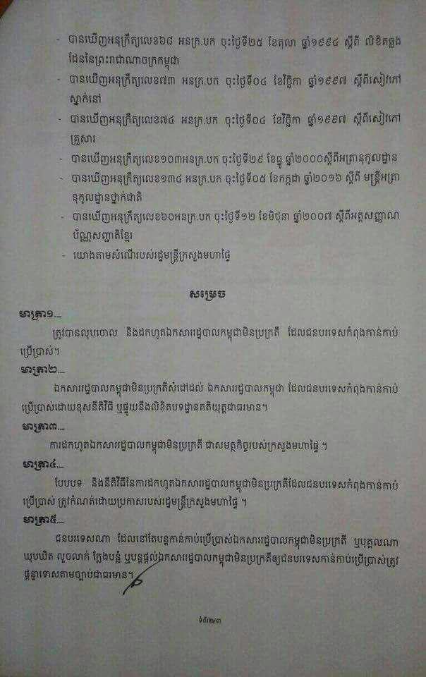 (ភ្នំពេញ)៖ ប្រមុខរាជរដ្ឋាភិបាលកម្ពុជា សម្តេចតេជោ ហ៊ុន សែន បានចេញអនុក្រឹត្យសម្រេចលុបចោលនិងដកហូតឯកសាររដ្ឋបាលកម្ពុជាមិនប្រក្រតីដែលជនបរទេសកំពុងកាន់កាប់ និងកំពុងប្រើប្រាស់។នៅក្នុងអនុក្រឹត្យដែលទើបទទួលបាននេះ បានបញ្ជាក់ថា ឯកសាររដ្ឋបាលកម្ពុជាមិនប្រក្រតីគឺសំដៅដល់ឯកសាររដ្ឋបាលកម្ពុជាដែលជនបរទេសកំពុងកាន់កាប់ និងប្រើប្រាស់ដោយខុសច្បាប់ ឬផ្ទុយនឹងលិខិតបទដ្ឋានគតិយុត្តជាធរមាន។អនុក្រឹត្យនេះក៏បានកំណត់ដែរថា ការដកហូតឯកសាររដ្ឋបាលកម្ពុជាមិនប្រក្រតីជាសមត្ថកិច្ចរបស់ក្រសួងមហាផ្ទៃ ហើយបែបបទនិងនីតិវិធីនៃការដកហូតឯកសាររដ្ឋបាលកម្ពុជាមិនប្រក្រតីដែលជនបរទេសកំពុងកាន់កាប់ប្រើប្រាស់ ត្រូវកំណត់ដោយប្រកាសរបស់រដ្ឋមន្រ្តីក្រសួងមហាផ្ទៃ។ចំណែកជនរបរទេសណាដែលនៅតែបន្តកាន់កាប់ប្រើប្រាស់ឯកសាររដ្ឋបាលកម្ពុជាមិនប្រក្រតី ឬបុគ្គលណាដែលឃុបឃិត លួចលាក់ក្លែងបន្លំ ឬបន្តផ្តល់ឯកសាររដ្ឋបាលកម្ពុជា មិនប្រក្រតីឱ្យជនបរទេសកាន់កាប់ប្រើប្រាស់នោះត្រូវផ្តន្ទាទោសតាមច្បាប់ជាធរមាន៕