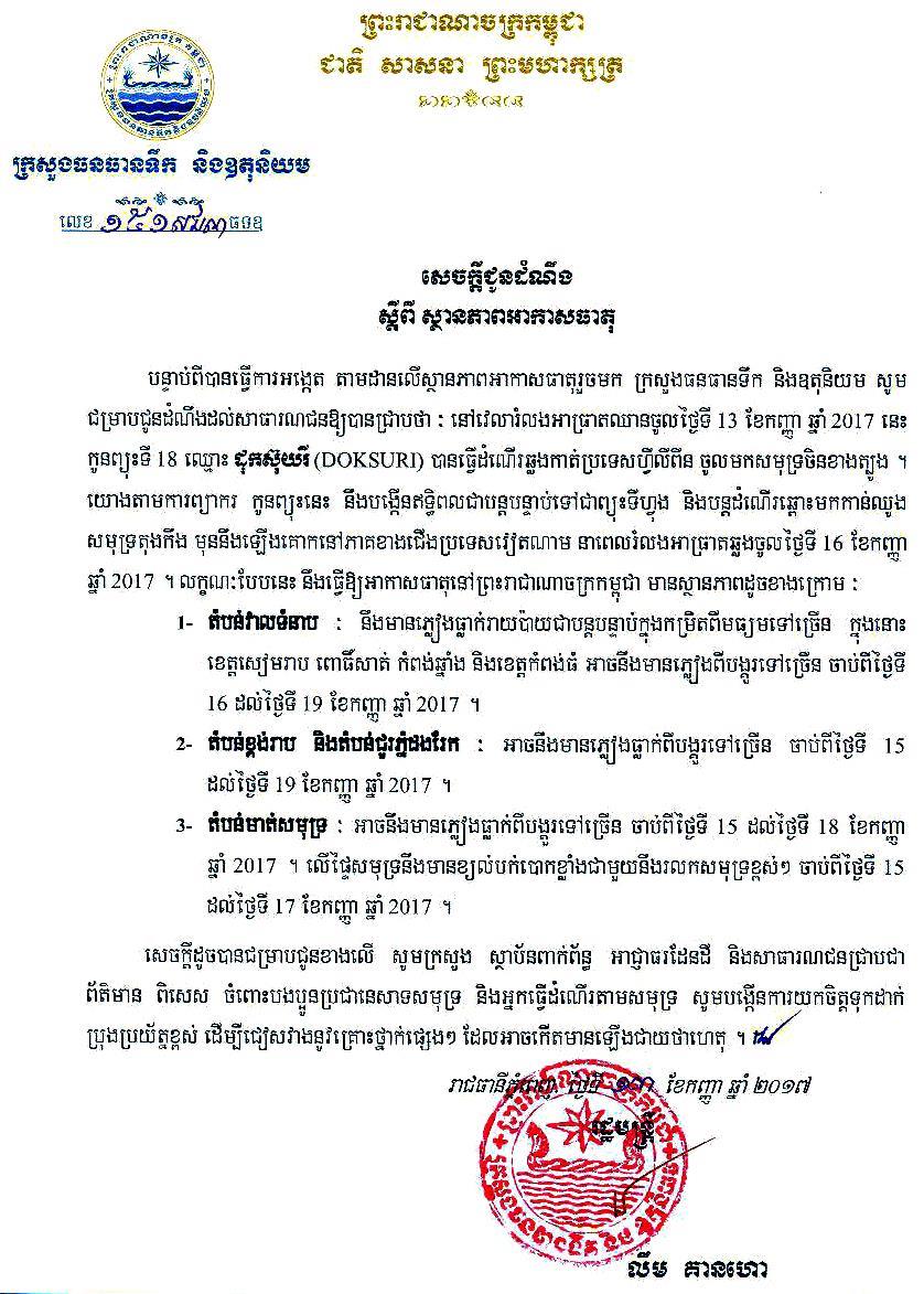 ភ្នំពេញ៖ ក្រសួងធនធានទឹក និងឧតុនិយម បានចេញសេចក្តីជូនដំណឹងបញ្ជាក់ឲ្យដឹងថា កម្ពុជានឹងមានភ្លៀងធ្លាក់រាយប៉ាយ និងខ្យល់កន្រ្តាក់ នៅទូទាំងប្រទេស ចាប់ពីថ្ងៃនេះ ដល់ថ្ងៃទី១៩ ខែកញ្ញា ឆ្នាំ២០១៧។ ក្រសួងធនធានទឹក និងឧតុនិយមបានបញ្ជាក់ទៀតថា ភ្លៀងធ្លាក់រាយប៉ាយ និងខ្យល់កន្រ្តាក់ នឹងកើតមានឡើងនៅក្នុងតំបន់មួយចំនួនរួមមាន៖ ១៖ តំបន់វាលទំនាប នឹងមានភ្លៀងធ្លាក់រាយប៉ាយជាបន្តបន្ទាប់ ក្នុងកម្រិតមធ្យមទៅច្រើន ក្នុងនោះមាននៅខេត្តសៀមរាប ពោធិ៍សាត់ កំពង់ឆ្នាំង និងខេត្តកំពង់ធំ អាចនឹងមានភ្លៀងធ្លាក់ពីបង្គួរទៅច្រើន ចាប់ពីថ្ងៃទី១៦ ដល់ថ្ងៃទី១៩ ខែកញ្ញា ឆ្នាំ២០១៧។ ២៖ តំបន់ខ្ពង់រាប និងតំបន់ជួរភ្នំដងវែកវិញ អាចនឹងមានភ្លៀងធ្លាក់ពីបង្គួរទៅច្រើន ចាប់ពីថ្ងៃទី១៥ ដល់ថ្ងៃទី១៩ ខែកញ្ញា ឆ្នាំ២០១៧។ ៣៖ តំបន់មាត់សមុទ្រ អាចនឹងមានភ្លៀងធ្លាក់បង្គួរ ទៅច្រើនចាប់ពីថ្ងៃទី១៥ ដល់ថ្ងៃទី១៨ ខែកញ្ញា ឆ្នាំ២០១៧។ លើផ្ទៃសមុទ្រនឹង មានខ្យល់បក់បោកខ្លាំង ជាមួយនឹងរលកសមុទ្រខ្ពស់ ចាប់ពីថ្ងៃទី១៥ ដល់ថ្ងៃទី១៧ ខែកញ្ញា ឆ្នាំ២០១៧។ ជាមួយគ្នានេះ ក្រសួងធនធានទឹក សូមអំពាវនាវឲ្យស្ថាប័នពាក់ព័ន្ធ អាជ្ញាធរដែនដី និងប្រជាពលរដ្ឋ ជាពិសេសបងប្អូនប្រជានេសាទ សមុទ្រ និងអ្នកធ្វើដំណើរតាមសមុទ្រ សូមបង្កើនការយកចិត្តទុកដាក់ ប្រុងប្រយ័ត្នខ្ពស់ ដើម្បីជៀសវាងនូវគ្រោះថ្នាក់ផ្សេងៗដែលអាច កើតមានជាយថាហេតុ៕