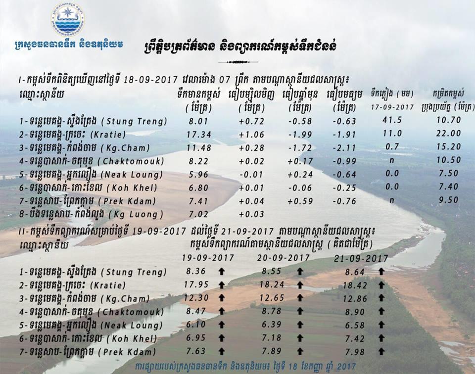 ភ្នំពេញ៖ ក្រសួងធនធានទឹក និងឧតុនិយម នៅព្រឹកថ្ងៃទី១៨ ខែកញ្ញា ឆ្នាំ២០១៧នេះ បានចេញព្រឹត្តបត្រព័ត៌មាន និងព្យាករណ៍កម្ពស់ទឹកជំនន់ នៅតាមបណ្តាស្ថានីយជលសាស្ត្រទាំង៨ រួមមានស្ថានីយ៖ ១-ទន្លេមេគង្គ-ស្ទឹងត្រែង ២-ទន្លេមេគង្គ-ក្រចេះ ៣-ទន្លេមេគង្គ-កំពង់ចាម ៤-ទន្លេបាសាក់-ចតុមុខ ៥-ទន្លេមេគង្គ-អ្នកលឿង ៦-ទន្លេបាសាក់-កោះខែល ៧-ទន្លេសាប-ព្រែកក្តាម