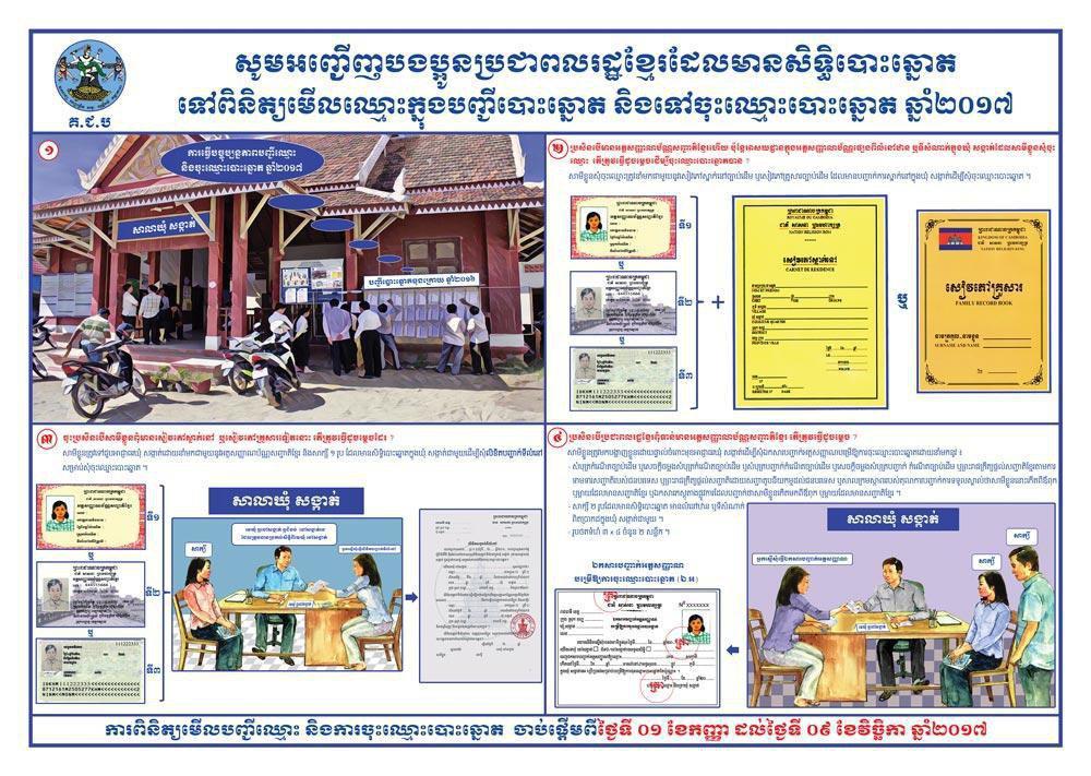 ភ្នំពេញ៖ គិតត្រឹមថ្ងៃទី២៥ ខែកញ្ញានេះ គឺនៅសល់តែ៤៥ថ្ងៃទៀតប៉ុណ្ណោះ ការចុះឈ្មោះបោះឆ្នោត ក្នុងបញ្ជីបោះឆ្នោតថ្មី ឆ្នាំ២០១៧ និងធ្វើបច្ចុប្បន្នភាពបញ្ជីបោះឆ្នោត ឆ្នាំ២០១៦ឡើងនឹងត្រូវបញ្ចប់ សូមបងប្អូនដែលគ្រប់អាយុបោះឆ្នោត អ្នកផ្លាស់ប្តូរទីលំនៅ និងអ្នកគ្រប់អាយុបោះឆ្នោតហើយតែមិនទាន់ចុះឈ្មោះ សូមរួសរាន់ទៅចុះឈ្មោះឲ្យបានគ្រប់ៗគ្នា។ ដំណើរការចុះឈ្មោះបោះឆ្នោត ក្នុងបញ្ជីបោះឆ្នោតថ្មី ឆ្នាំ២០១៧ និងធ្វើបច្ចុប្បន្នភាពបញ្ជីបោះឆ្នោត ឆ្នាំ២០១៦ មានរយៈពេល៧០ថ្ងៃ ចាប់ពីថ្ងៃទី០១ ខែកញ្ញា ដល់ថ្ងៃទី០៩ ខែវិច្ឆិកា ឆ្នាំ២០១៧។ លោក ហង្ស ពុទ្ធា អ្នកនាំពាក្យ គ.ជ.ប បានបញ្ជាក់ប្រាប់ឲ្យដឹងថា ការចុះឈ្មោះបោះឆ្នោតថ្មី ធ្វើឡើងសម្រាប់តែប្រជាពលរដ្ឋណាដែល៖ ១៖ គ្រប់អាយុបោះឆ្នោតជ្រើសតាំងតំណាងរាស្រ្ត នីតិកាលទី៦ នៃរដ្ឋសភា ពោលគឺអាយុ១៨ឆ្នាំ (គិតដល់ថ្ងៃបោះឆ្នោត)។ ២៖ អ្នកគ្រប់អាយុយូរហើយ តែមិនទាន់បានចុះឈ្មោះបោះឆ្នោតនឹងគេ កាលពីឆ្នាំ២០១៦ កន្លងទៅ។ ៣៖ អ្នកដែលចុះឈ្មោះបោះឆ្នោត ឆ្នាំ២០១៦ រួចហើយ តែបានផ្លាស់ប្ដូរទីលំនៅ ឬទីសំណាក់ទៅឃុំ-សង្កាត់ផ្សេង។ ប្រសិនបើអ្នកមានទីលំនៅច្រើនជាងមួយកន្លែង អ្នកត្រូវជ្រើសរើសយក ទីតាំងលំនៅដ្ឋានណាមួយ ដើម្បីចុះឈ្មោះរបស់អ្នកក្នុងបញ្ជីបោះឆ្នោតថ្មីនោះ។ មិនខុសពីការចុះឈ្មោះបោះឆ្នោត កាលពីឆ្នាំ២០១៦ឡើយ ដើម្បីចុះឈ្មោះបោះឆ្នោតថ្មី ឆ្នាំ២០១៧បាន ពលរដ្ឋត្រូវមានអត្តសញ្ញាណប័ណ្ណសញ្ជាតិខ្មែ។ ប្រសិនបើគ្មានអត្តសញ្ញាណប័ណ្ណសញ្ជាតិខ្មែរទេ ពលរដ្ឋត្រូវមានឯកសារបញ្ជាក់អត្តសញ្ញាណ បម្រើឲ្យការចុះឈ្មោះបោះឆ្នោតជំនួសវិញ។ ដើម្បីបានឯកសារបញ្ជាក់អត្តសញ្ញាណ បម្រើឲ្យការចុះឈ្មោះបោះឆ្នោត ពលរដ្ឋសាម៉ីត្រូវទៅស្នើសុំពីសាលាឃុំ-សង្កាត់ ដែលខ្លួនកំពុងស្នាក់នៅ ដោយនាំទៅជាមួយនូវសាក្សី ដែលមានសិទ្ធិបោះឆ្នោត ហើយរស់នៅក្នុងឃុំ-សង្កាត់ជាមួយគ្នាចំនួន២នាក់ និងរូបថតទំហំ ៣គុណ៤ ចំនួន២សន្លឹក។ គ.ជ.ប បានឲ្យដឹងថា ក្នុងករណីអាសយដ្ឋានរបស់អ្នក ខុសពីអាសយដ្ឋានក្នុងអត្តសញ្ញាណប័ណ្ណសញ្ជាតិខ្មែររបស់ខ្លួន អ្នកត្រូវភ្ជាប់មកជាមួយសៀវភៅស្នាក់នៅ (ច្បាប់ដើម) ឬសៀវភៅគ្រួសារ (ច្បាប់ដើម) ឬលិខិតបញ្ជាក់ទីលំនៅ។ ដើម្បីទទួលបានលិខិតបញ្ជាក់ទីលំនៅ ពីអាជ្ញាធរឃុំ-សង្កាត់ អ្នកត្រូវភ្ជាប់មកជាមួយនូវអត្តសញ្ញាណប័ណ្ណសញ្ជាតិខ្មែររបស់អ្នក និងសាក្សីម្នាក់ ដែលជាអ្នកមានសិទ្ធិបោះឆ្នោត ហើយរស់នៅក្នុងឃុំ-សង្កាត់ជាមួយអ្នកទៀតផង។ លោក ហង្ស ពុទ្ធា បានបន្តថា ចំណែកឯការធ្វើបច្ចុប្បន្នភាព បញ្ជីបោះឆ្នោត ឆ្នាំ២០១៦វិញ គឺធ្វើឡើងសម្រាប់តែប្រជាពលរដ្ឋណាដែល៖ ១៖ ត្រូវការកែប្រែទិន្នន័យ ក្នុងបញ្ជីបោះឆ្នោត ឆ្នាំ២០១៦ ដ