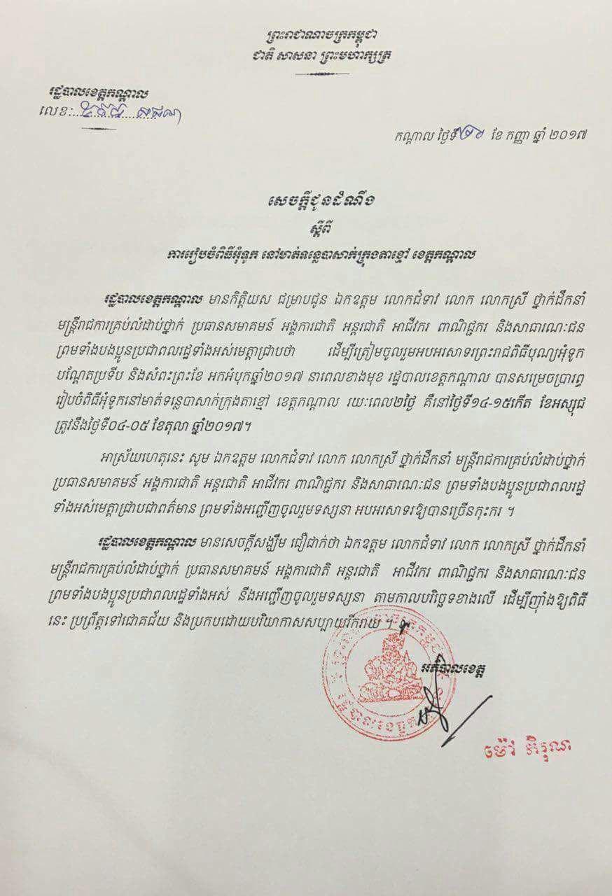 រដ្ឋបាលក្រុងនឹងរៀបចំពិធីអូំទូកតាមដងទន្លេបាសាក់ នៅក្រុងតាខ្មៅ ចាប់ពីថ្ងៃទី៤ និងទី៥ ខែតុលា ឆ្នាំ២០១៧ និងមានការតាំងពិពណ៌ បណ្ដែតប្រទីប បង្ហោះគោម បាញ់កាំជ្រួច ។នេះបើតាមសេចក្តីជូនដំណឹងរបស់លោកអភិបាលខេត្តម៉ោ ភារុណ។