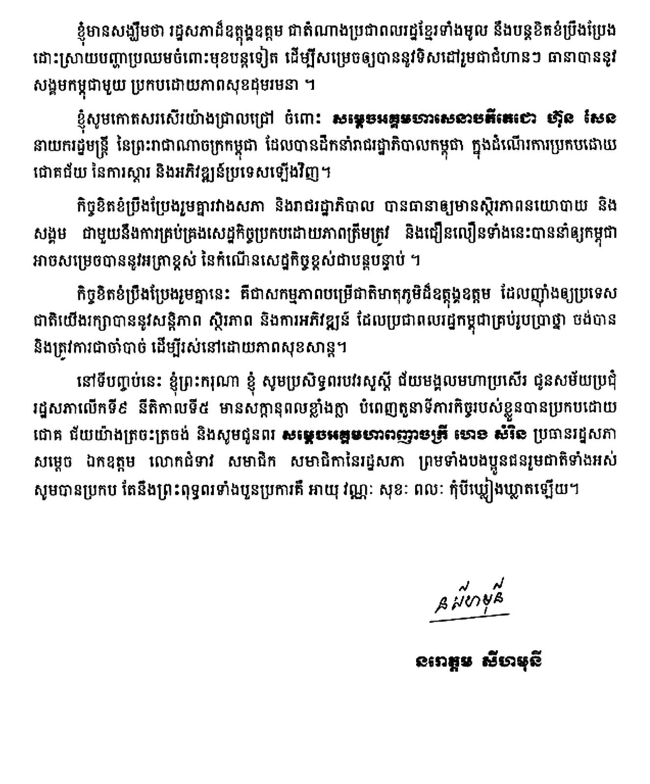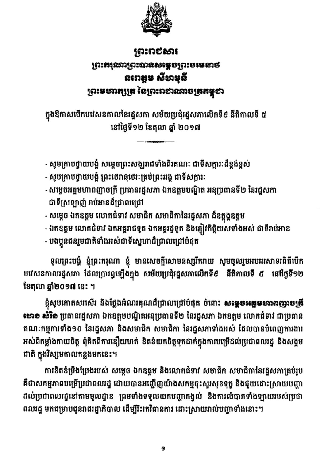 ភ្នំពេញ៖ រដ្ឋសភា បានបើកសម័យប្រជុំពេញអង្គលើកទី៩ នីតិកាលទី៥ ដោយមានរបៀបវារៈចំនួន៦នៅព្រឹកថ្ងៃទី១២ ខែតុលា ឆ្នាំ២០១៧នេះ។ ក្នុងព្រះរាជសារព្រះមហាក្សត្រ ព្រះអង្គបានកោតសរសើរដល់រដ្ឋសភា និងរាជរដ្ឋាភិបាលកម្ពុជា ដែលបានរួមគ្នាបម្រើប្រជាពលរដ្ឋ និងរក្សាស្ថិរភាពនយោបាយ សន្តិសុខ និងការអភិវឌ្ឍសម្រាប់កម្ពុជា។ក្នុងនោះក៏មានព្រះរាជសារព្រះមហាក្សត្រ សម្រាប់ការបើកសម័យប្រជុំនេះផងដែរ៕