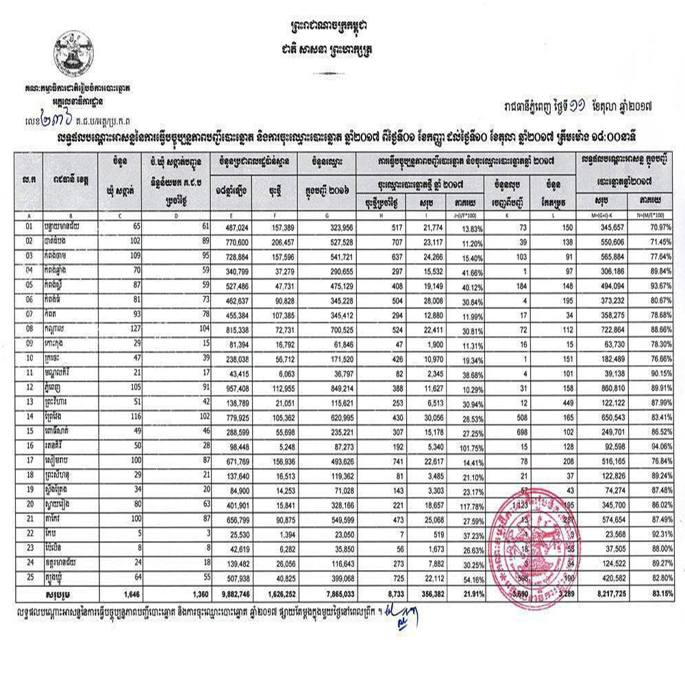 (ភ្នំពេញ)៖ តាមការប៉ាន់ស្មានរបស់គណៈកម្មាធិការជាតិរៀបចំការបោះឆ្នោត គ.ជ.ប ប្រជាពលរដ្ឋខ្មែរដែលត្រូវមកចុះបោះឆ្នោត ក្នុងបញ្ជីចុះឈ្មោះបោះឆ្នោតថ្មី ឆ្នាំ២០១៧ មានជាង១.៦លាននាក់ ខណៈប្រជាពលរដ្ឋខ្មែរដែលមានអាយុ១៨ឆ្នាំឡើងទៅ មានប្រមាណ៩.៨លាននាក់។ និងខណៈអ្នកដែលត្រូវលុបឈ្មោះចេញមានចំនួន ៣,៦៩០នាក់ និងអ្នកខុសកែតម្រូវមានចំនួន ៣,២៨៩នាក់។បច្ចុប្បន្នភាពបញ្ជីបោះឆ្នោត និងការចុះឈ្មោះបោះឆ្នោត ឆ្នាំ២០១៧ មានប្រជាពលរដ្ឋទៅចុះឈ្មោះជិត ៣៦ម៉ឺននាក់ហើយ៕
