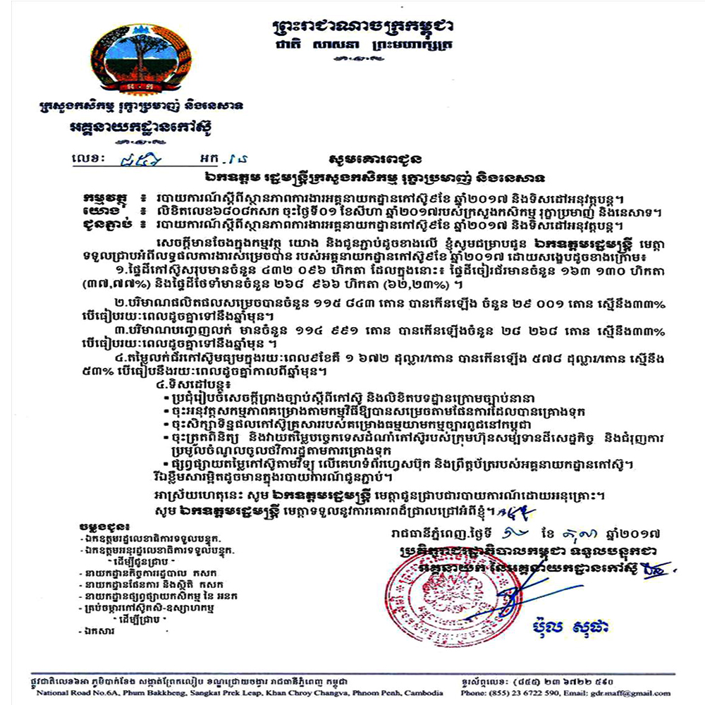 ភ្នំពេញ៖របាយការណ៍របស់អគ្គនាយកដ្ឋានកៅស៊ូ បានបញ្ជាក់ឲ្យដឹងថា រយៈពេល៩ខែ ឆ្នាំ២០១៧ ចាប់ពីខែមករា ដល់ខែកញ្ញា កម្ពុជាប្រមូលផលជ័រកៅស៊ូបានចំនួន ១១៥,៨៤៣តោន ក្នុងនោះបាននាំចេញជ័រកៅស៊ូចំនួន ១១៤,៩៩១តោន ដោយទទួលបានទឹកប្រាក់ចំនួន ១៩២,២៦៤,៩៥២ដុល្លារ ដែលតម្លៃជ័រកៅស៊ូជាមធ្យម ថ្លៃ១,៦៨២ដុល្លារ ក្នុងមួយតោន។ផ្ទៃដីកៅស៊ូរបស់កម្ពុជាសរុបមានចំនួន ៤៣២,០៩៦ហិកតា ដែលក្នុងនោះ ផ្ទៃដីចៀរជ័រមានចំនួន ១៦៣,១៣០ហិកតា ស្មើនឹង៣៧.៧៧% និងផ្ទៃដីថែទាំមានចំនួន ២៦៨,៩៦៦ហិកតា ស្មើនឹង៦២.២៣%។កៅស៊ូកម្ពុជា បាននាំចេញទៅកាន់ប្រទេសចិន វៀតណាម សិង្ហបុរី និងម៉ាឡេស៊ី។ នៅឆ្នាំ២០១៦ កន្លងទៅ កម្ពុជាបាននាំចេញជ័រកៅស៊ូបានជាង ១៤ម៉ឺនតោន ទទួលបានទឹកប្រាក់ជាង ១៨០លានដុល្លារ។នេះបើតាមរបាយការណ៍ផ្លូវការរបស់អគ្គនាយកដ្ឋានកៅស៊ូ ផ្ញើជូនរដ្ឋមន្ត្រីក្រសួងកសិកម្ម រុក្ខាប្រមាញ់ និងនេសាទ ៕