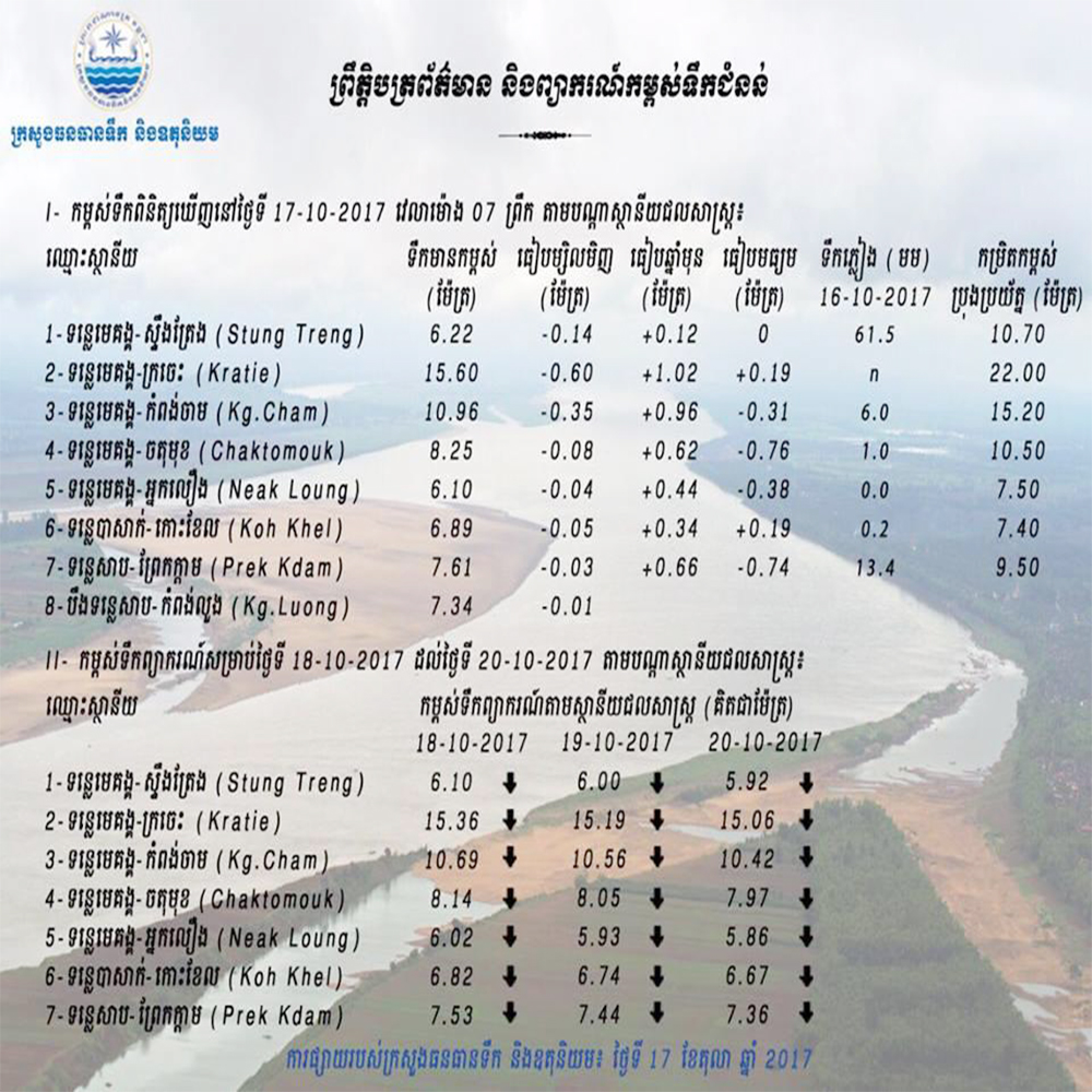 ភ្នំពេញ៖ នៅព្រឹកថ្ងៃទី១៧ ខែតុលា ឆ្នាំ២០១៧នេះ ក្រសួងធនធានទឹក និងឧតុនិយម បានចេញព្រឹត្តបត្រព័ត៌មាន និងព្យាករណ៍កម្ពស់ទឹកជំនន់ នៅតាមបណ្តាស្ថានីយជលសាស្ត្រទាំង៨ រួមមានស្ថានីយ៖