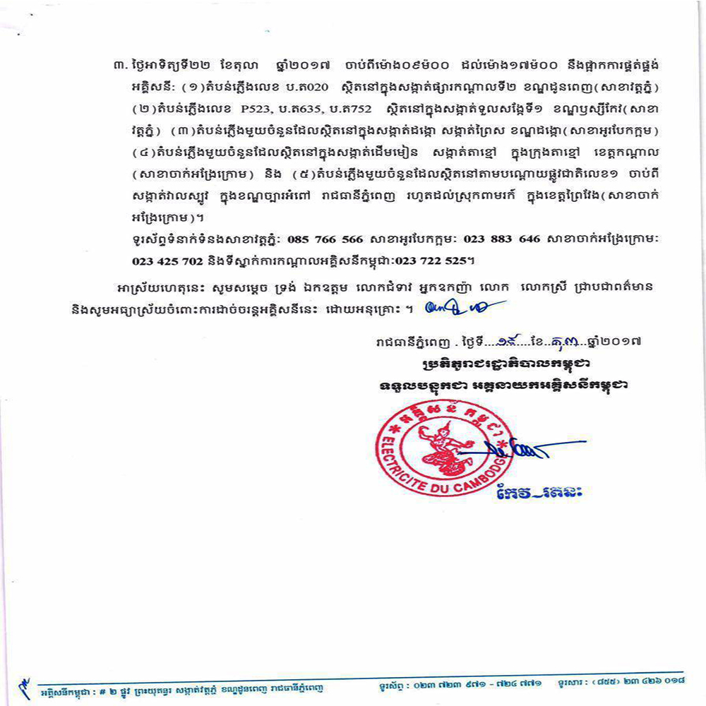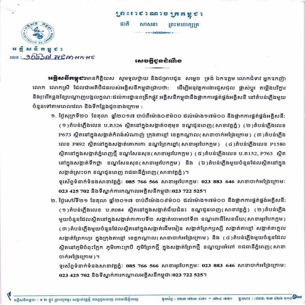 សម្រាប់ព័ត៌មានលម្អិត សូមអានសេចក្ដីជូនដំណឹងរបស់អគ្គិសនីកម្ពុជាដូចខាងក្រោម៖