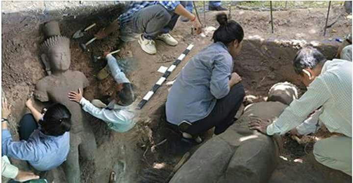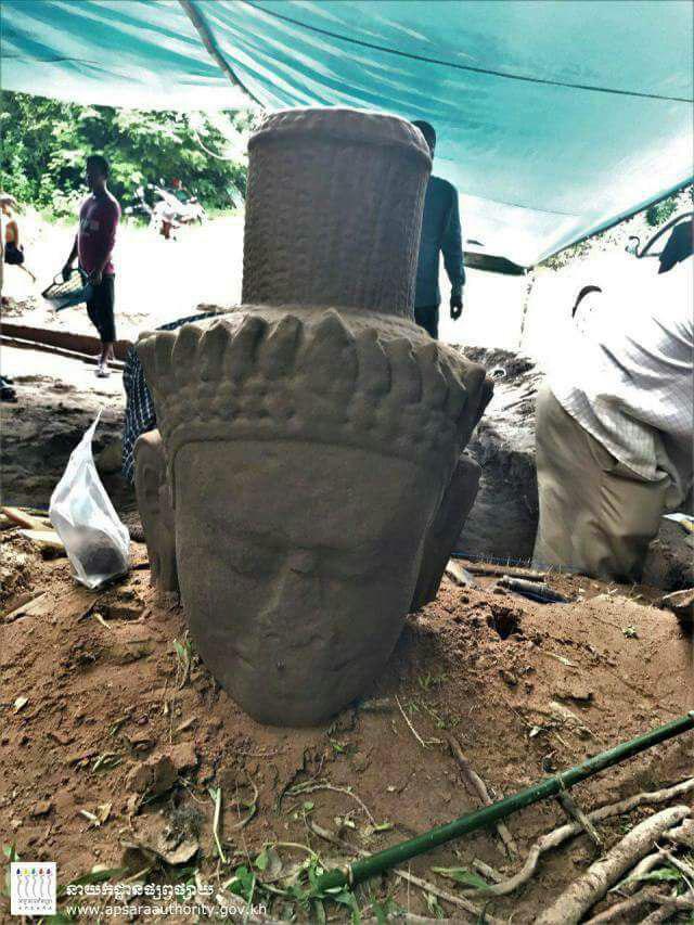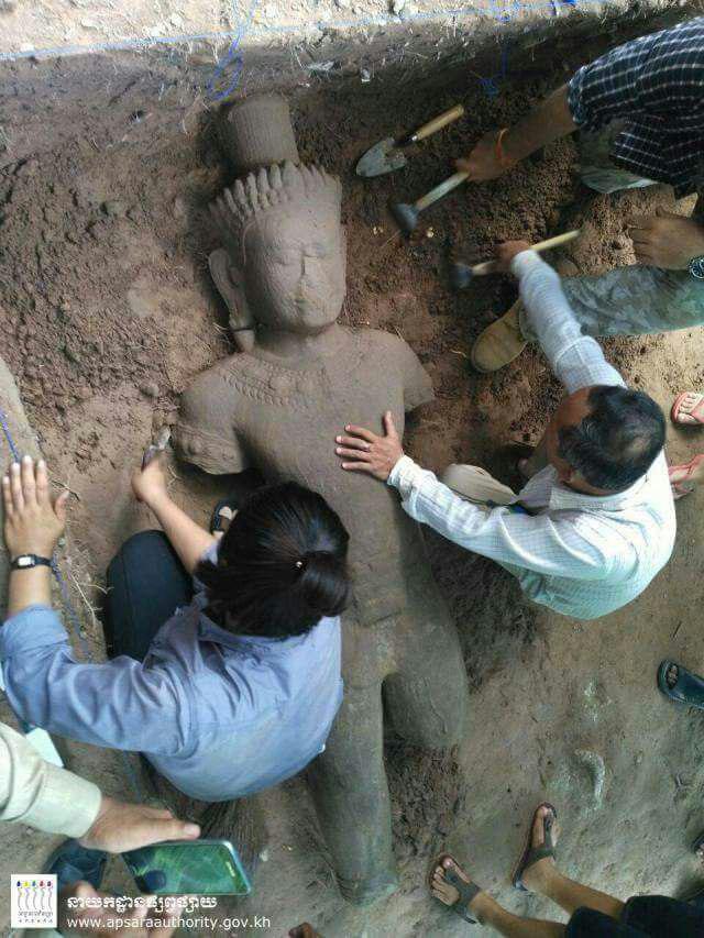 លោក ខៀវ ច័ន្ទ មន្ត្រីជំនាញផ្នែកបុរាណវិទ្យានៃអាជ្ញាធរជាតិអប្សរា នៅការដ្ឋានកំណាយនេះបញ្ជាក់ថា វាជាការប្រទះដោយចៃដន្យក្នុងពេលដែលក្រុមការងារធ្វើកំណាយដើម្បីសិក្សាអំពីទំនាក់ទំនងរវាងប្រឡាយមុខមន្ទីរពេទ្យ និងរចនាសម្ព័ន្ធនៃមន្ទីរពេទ្យទន្លេស្ងួត។ ការប្រទះឃើញចម្លាក់ដ៏ធំនេះក៏ចាត់ថាជាសំណាងល្អមួយ ដែលអាចឲ្យយើងយកទៅរក្សាទុកក្នុងទីកន្លែងសមរម្យ ហើយងាយស្រួលសម្រាប់អ្នកស្រាវជ្រាវ ដើម្បីសិក្សាលម្អិតបន្ថែមទៀត។ លោកបន្ថែមថា «បន្ទាប់ពីអ្នកជំនាញធ្វើកំណត់ត្រារួចរាល់ បដិមានេះនឹងត្រូវយកទៅតម្កល់ទុកក្នុងសារមន្ទីរព្រះនរោត្តមសីហនុអង្គរដើម្បីរក្សាសុវត្ថិភាព សម្អាតដុសលាង ព្យាបាលផ្នែកខ្លះ ជាពិសេស គឺការយកជាតិអំបិលចេញដើម្បីកុំឲ្យមានការខូចគុណភាពថ្ម ឬរងប្រតិកម្មនៅពេលដែលចម្លាក់ត្រូវដាក់តាំងក្នុងលំហបរិយាសថ្មី»។ លើសពីនេះទៀត បដិមានឹងត្រូវដាក់តាំងបង្ហាញសម្រាប់ភ្ញៀវទេសចរបានចូលទស្សនា។