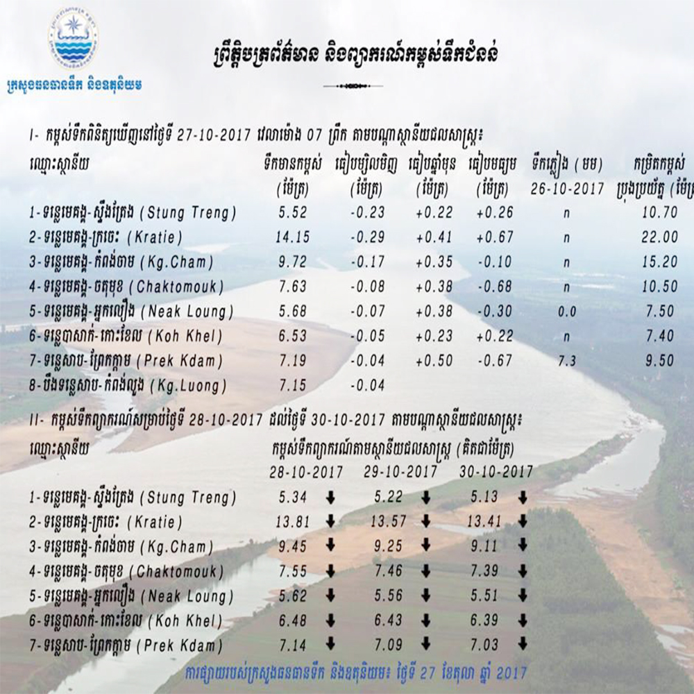 ភ្នំពេញ ៖ នៅព្រឹកថ្ងៃទី២៧ ខែតុលា ឆ្នាំ២០១៧នេះក្រសួងធនធានទឹក និងឧតុនិយម បានចេញព្រឹត្តបត្រព័ត៌មាន និងព្យាករណ៍កម្ពស់ទឹកជំនន់ នៅតាមបណ្តាស្ថានីយជលសាស្ត្រទាំង៨ រួមមានស្ថានីយ៖