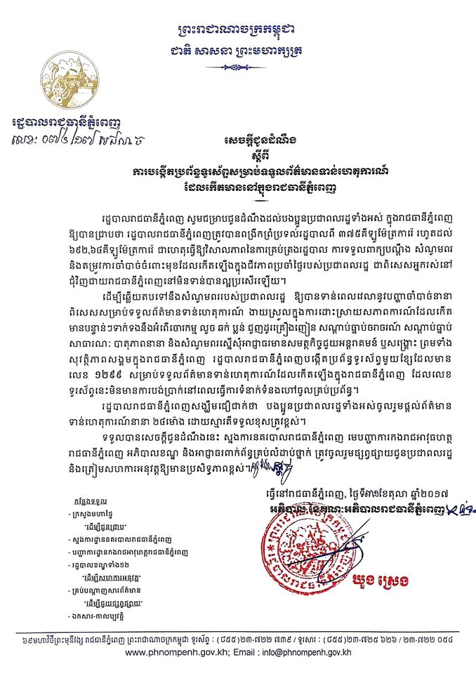 ក្នុងសេចក្ដីជូនដំណឹង បានបញ្ជាក់ថា រដ្ឋបាលរាជធានីភ្នំពេញ សង្ឃឹមជឿជាក់ថា បងប្អូនប្រជាពលរដ្ឋទាំងអស់ ចូលរួមផ្ដល់ព័ត៌មានទាន់ហេតុការណ៍នានា ២៤ម៉ោង ដោយស្មារតីទទួលខុសត្រូវខ្ពស់។