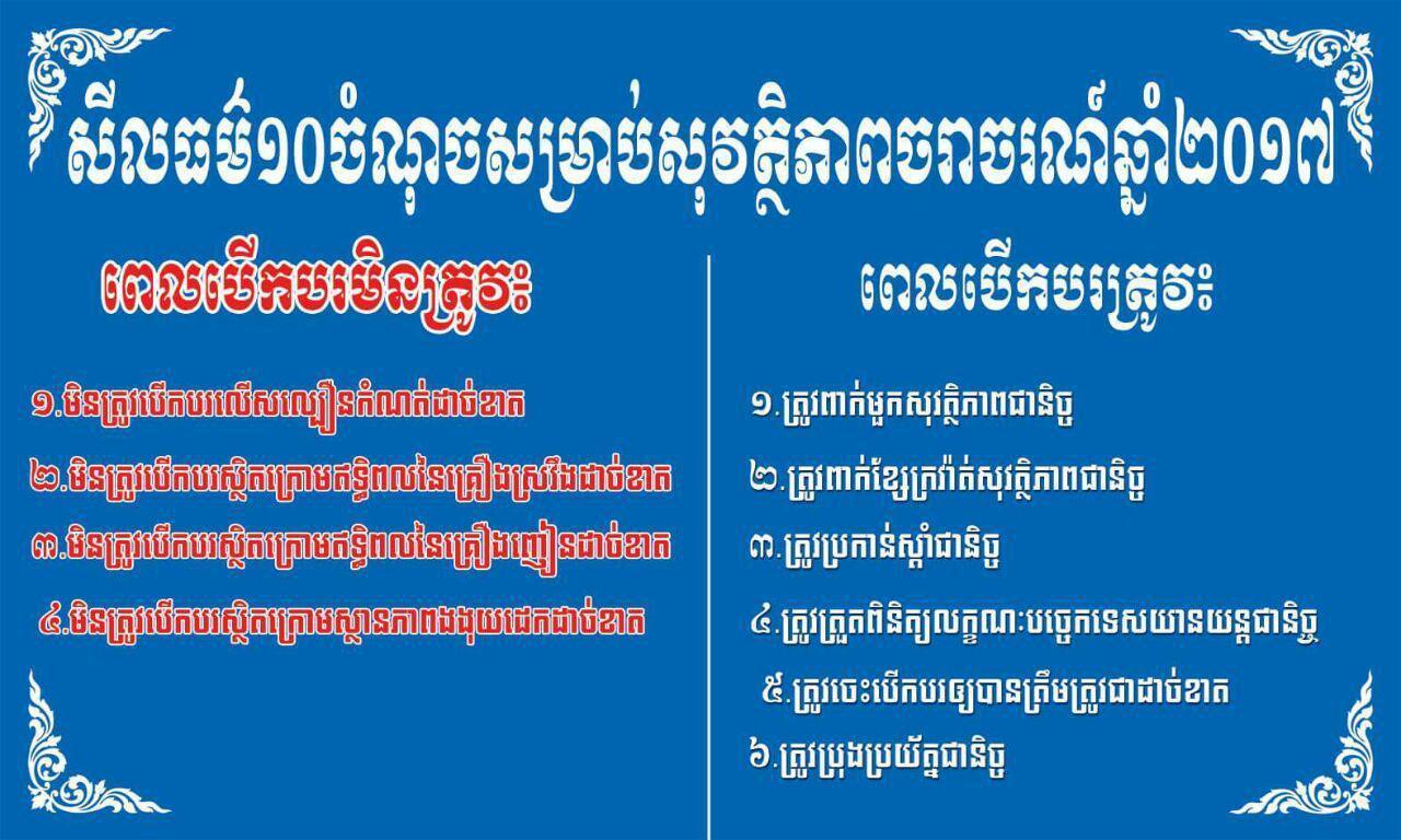 (ភ្នំពេញ)៖ យោងតាមរបាយការណ៍ ពីនាយកដ្ឋាននគរបាលចរាចរណ៍ និងសណ្ដាប់ធ្នាប់សាធារណៈ នៃអគ្គស្នងការដ្ឋាននគរបាលជាតិ បានឲ្យដឹងថា នៅថ្ងៃទី០៥ ខែវិច្ឆិកា ឆ្នាំ២០១៧ មានករណីគ្រោះថ្នាក់ចរាចរណ៍ នៅទូទាំងប្រទេសកើតឡើងចំនួន៩លើក បណ្ដាលឲ្យមនុស្សស្លាប់៥នាក់ របួសស្រាល៧នាក់ និងរបួសធ្ងន់១១នាក់។