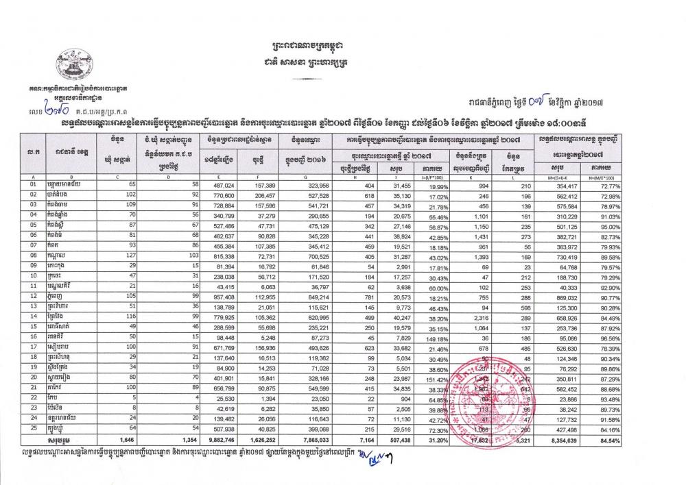 សេចក្តីប្រកាសព័ត៌មានរបស់ គ.ជ.ប បានឲ្យដឹងថា ចាប់ពីថ្ងៃទី០១ ខែកញ្ញា ដល់ថ្ងៃទី០៦ ខែវិច្ឆិកា ឆ្នាំ២០១៧ មានប្រជាពលរដ្ឋខ្មែរចំនួន ៥០៧,៤៣៨នាក់ បានទៅចុះឈ្មោះបោះឆ្នោតថ្មី ខណៈអ្នកត្រូវលុបឈ្មោះចោលមានចំនួនជាង១.៧ម៉ឺននាក់ និងអ្នកសុំកែតម្រូវឈ្មោះមានចំនួនជាង៥ពាន់នាក់។