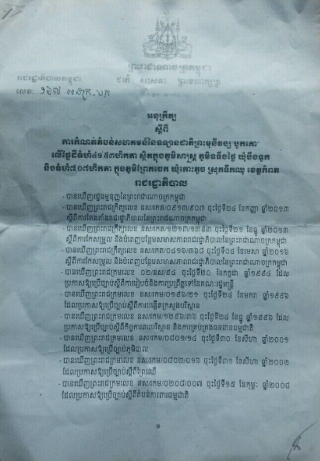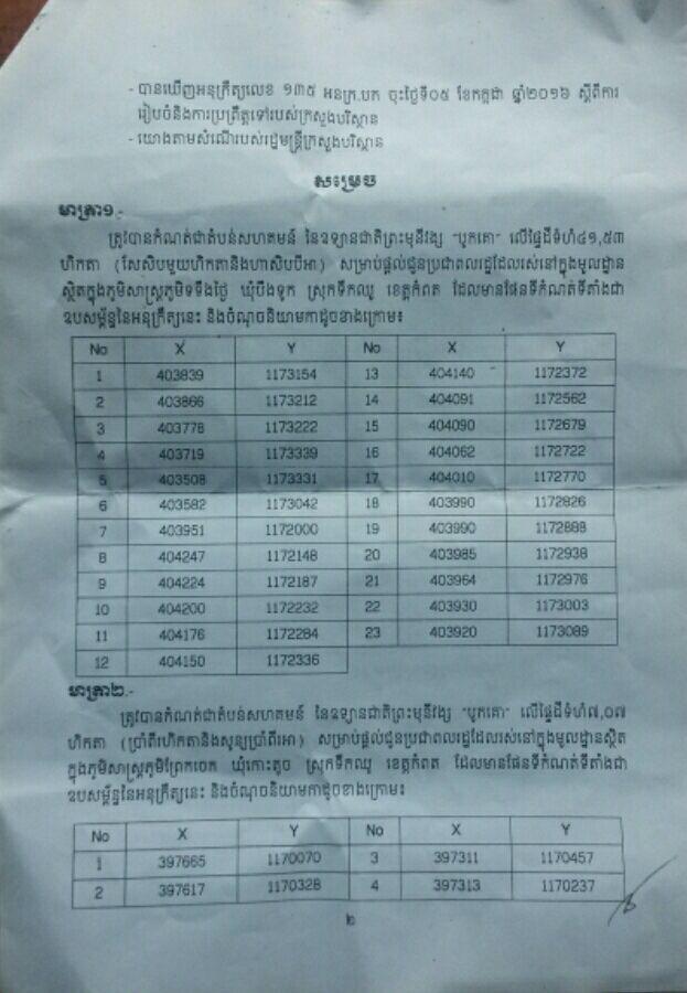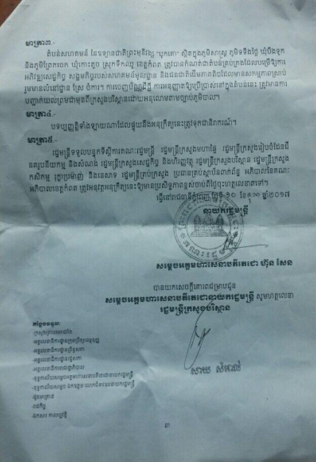 ក្នុងលិខិត បានបញ្ជាក់ទៀតថា ដោយឡែក សម្រេចតាមមាត្រា១ នៃអនុក្រិត្យខាងលើ ត្រូវកំណត់ជាតំបន់សហគមន៍ នៃឧទ្យានជាតិព្រះមុនីវង្ស «បូកគោ» លើផ្ទៃដីទំហំ ៤១,៥៣ ហិកតា (សែសិបមួយហិកតា និងហាសិបបីអា) សម្រាប់ផ្តល់ជូនប្រជាពលរដ្ឋ ដែលរស់នៅក្នុងមូលដ្ឋានស្ថិតក្នុងភូមិសាស្ត្រ ភូមិទទឹងថ្ងៃ ឃុំបឹងទូក ស្រុកទឹកឈូ ខេត្តកំពត ដែលមាន ផែនទីកំណត់ ទីតាំងជាឧបសម្ព័ន្ធ នៃអនុក្រឹត្យខាងលើនេះ និងចំណុចនិយាមកា។ ដែលបានផ្តល់យុត្តិធម៌ពិតប្រាកដល់យើងខ្ញុំទាំងអស់គ្នា។