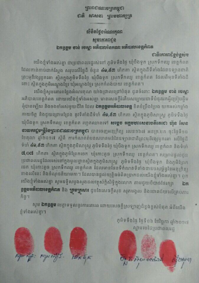 ទន្ទឹមគ្នានេះប្រជាពលរដ្ឋក៏មិនបានភ្លេចអរគុណចំពោះរដ្ឋមន្រ្តីក្រសួងបរិស្ថាន លោក សាយ សំអាល់ និងអភិបាលខេត្តកំពត លោក ចាន់ ចេស្តា ដែលបានខិតខំដោះស្រាយបញ្ហានេះ រហូតបានចេញអនុក្រឹត្យ។