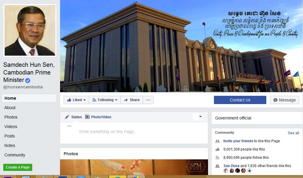 (ភ្នំពេញ)៖ នៅថ្ងៃទី១៣ ខែវិច្ឆិកា ឆ្នាំ២០១៧នេះ គេហទំព័រ Facebook ផ្លូវការសម្តេចតេជោ ហ៊ុន សែន នាយករដ្ឋមន្រ្តីនៃកម្ពុជា ដែលមានឈ្មោះថា «Samdech Hun Sen, Cambodian Prime Minister» ទទួលបានការគាំទ្រ (Like) យ៉ាងខ្លាំងកើនឡើងយ៉ាងឆាប់រហ័សជាង៩លាន Likes ។