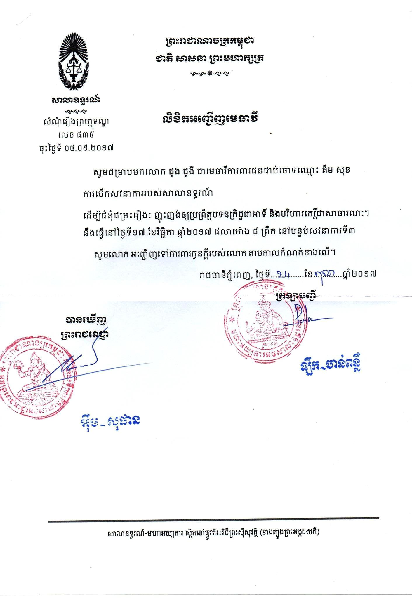(ភ្នំពេញ)៖ សាលាឧទ្ធរណ៍ នៅព្រឹកថ្ងៃទី១៧ ខែវិច្ឆិកានេះជំនុំជម្រះរឿងក្តីលោក គឹម សុខ អ្នកឃ្លាំមើលបញ្ហាសង្គមនិងនយោបាយ ពាក់ព័ន្ធការចោទប្រកាន់ថា គណបក្សប្រជាជនកម្ពុជា ជាអ្នកសម្លាប់បណ្ឌិត កែម ឡី។ នេះបើយោងតាមលិខិតអញ្ជើញមេធាវីជូង ជូងី ចូលរួមសវនាការ។