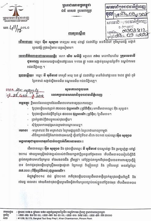 (ភ្នំពេញ)​៖ ​លោក ​អ៊ុក​ ​សុវណ្ណារិទ្ធ​ ចៅក្រម​សាលាដំបូង​រាជធានី​ភ្នំពេញ​បានចេញ​ដីកា​កោះហៅ​កញ្ញា​ នី ​មុន្នីនាថ​ ឱ្យ​​ចូលទៅ​បំភ្លឺ​ពាក់ព័ន្ធ​នឹង​ពាក្យបណ្តឹង​ទាមទារ​ប្រាក់​របស់​អតីត​គូ​ដណ្តឹង​ដែលជា​អាណិកជន​ខ្មែរ​នៅ​អាមេរិក នៅ​រសៀល​ថ្ងៃទី​២២ ខែវិច្ឆិកា ឆ្នាំ​២០១៧​ខាងមុខនេះ។​