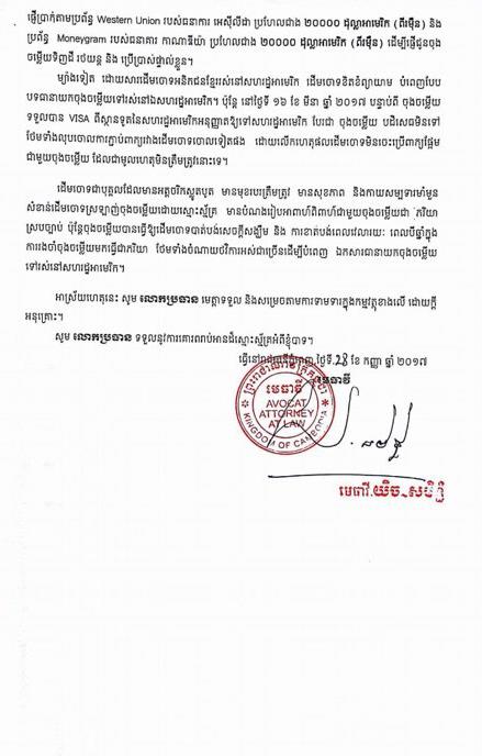 ​ប៉ុន្តែ​នៅ​ថ្ងៃទី​១៦ ខែមីនា ឆ្នាំ​២០១៧ បន្ទាប់ពី​ចុង​ចម្លើយ​បានទទួល​វី​សា​ឲ្យ​ទៅ​អាមេរិក បែរជា​មិន​ទៅ​ថែមទាំង​លប់ចោល​ការភ្ជាប់​ពាក្យរ​វាង​ដើមចោទ​ថែម​ទៀតផង ដោយ​លើក​ហេតុផល​ថា ដើមចោទ​មិនចេះ​ប្រើពាក្យ​ផ្អែម​ជាមួយ​ចុង​ចម្លើយ ដែលជា​មូលហេតុ​មិន​ត្រឹមត្រូវ​នោះទេ​។​ ​